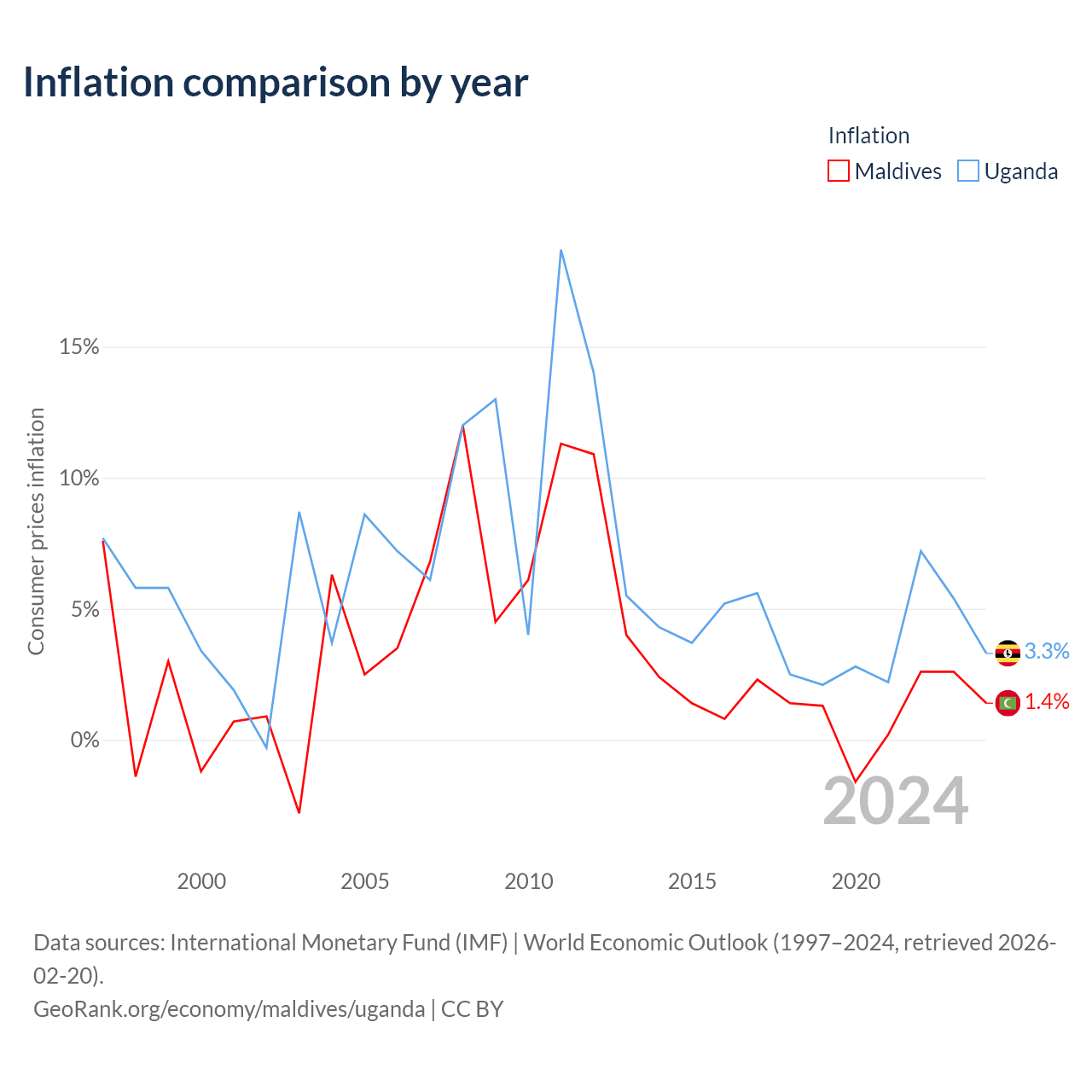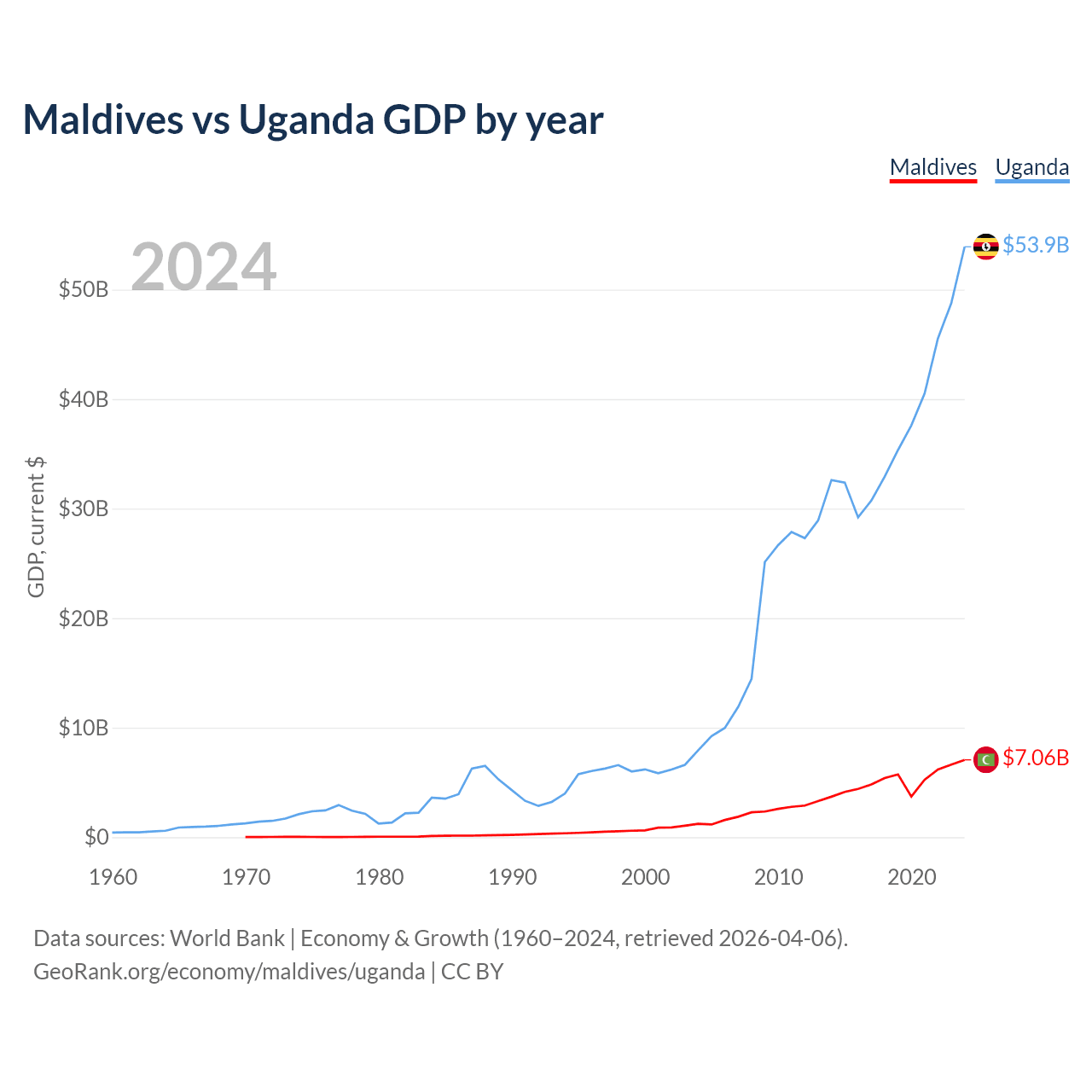 Maldives has a GDP of $7.06B compared to $53.9B for Uganda, ranking 159/197 and 89/197 by economy size, respectively.