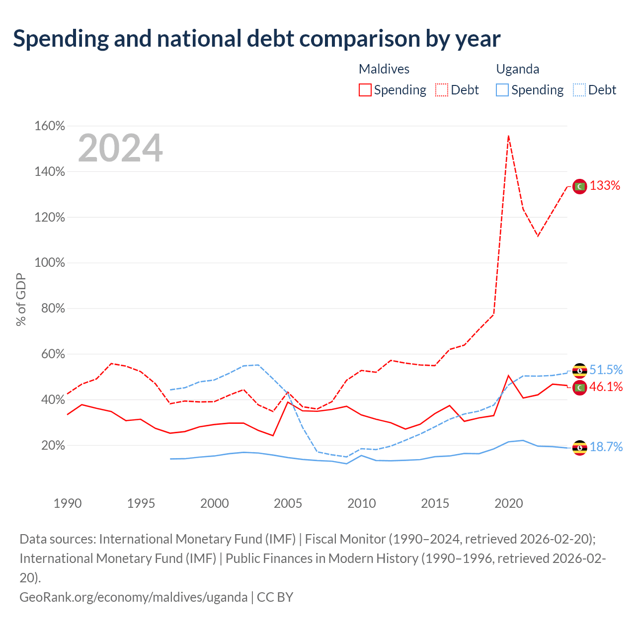 Maldives has $9.41B in government debt (133.3% of GDP), compared to $27.8B (51.5% of GDP) in Uganda.