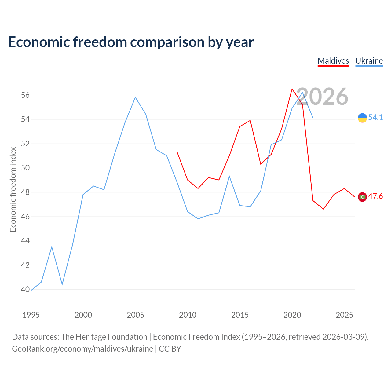 The Economic Freedom Index for Maldives is 47.6, ranking 174/197, compared to 54.1 for Ukraine, ranking 135/197. The chart above displays a comparison of annual changes in economic freedom indexes.