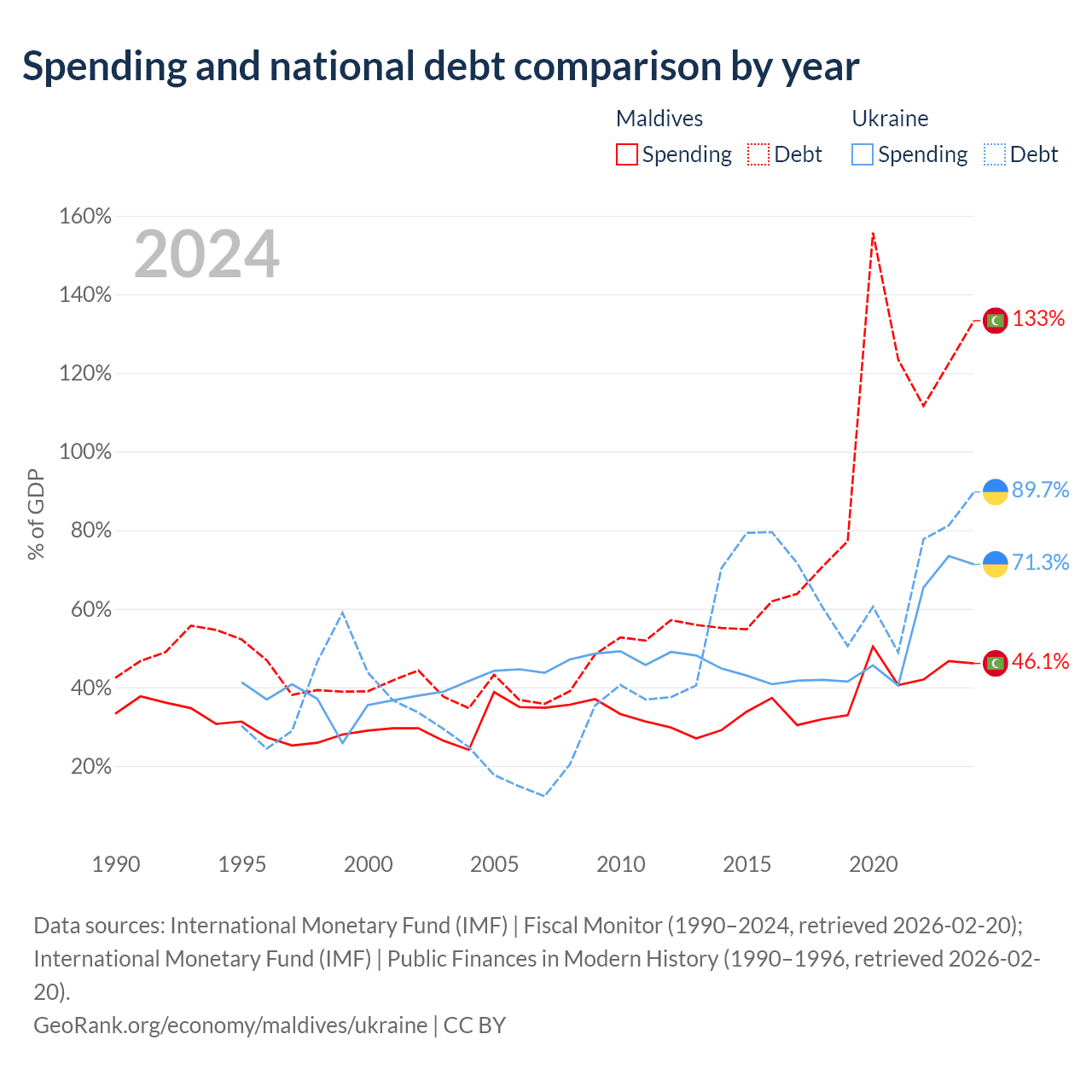 Maldives has $9.41B in government debt (133.3% of GDP), compared to $171B (89.7% of GDP) in Ukraine.