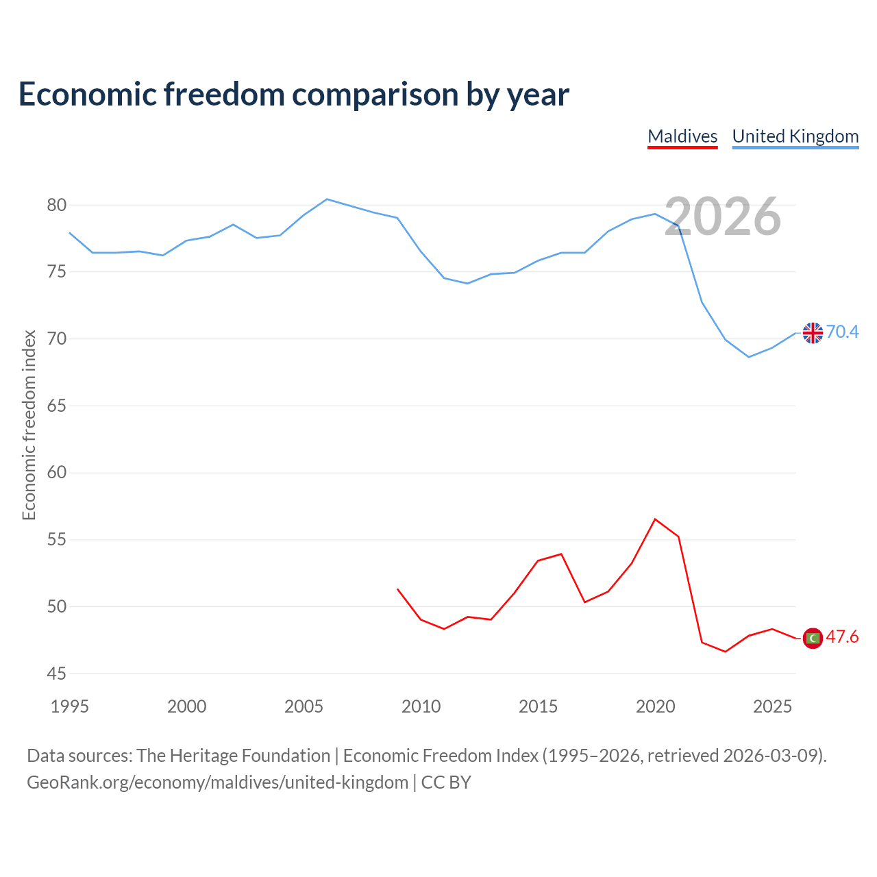 The Economic Freedom Index for Maldives is 47.6, ranking 174/197, compared to 70.4 for the United Kingdom, ranking 35/197. The chart above displays a comparison of annual changes in economic freedom indexes.