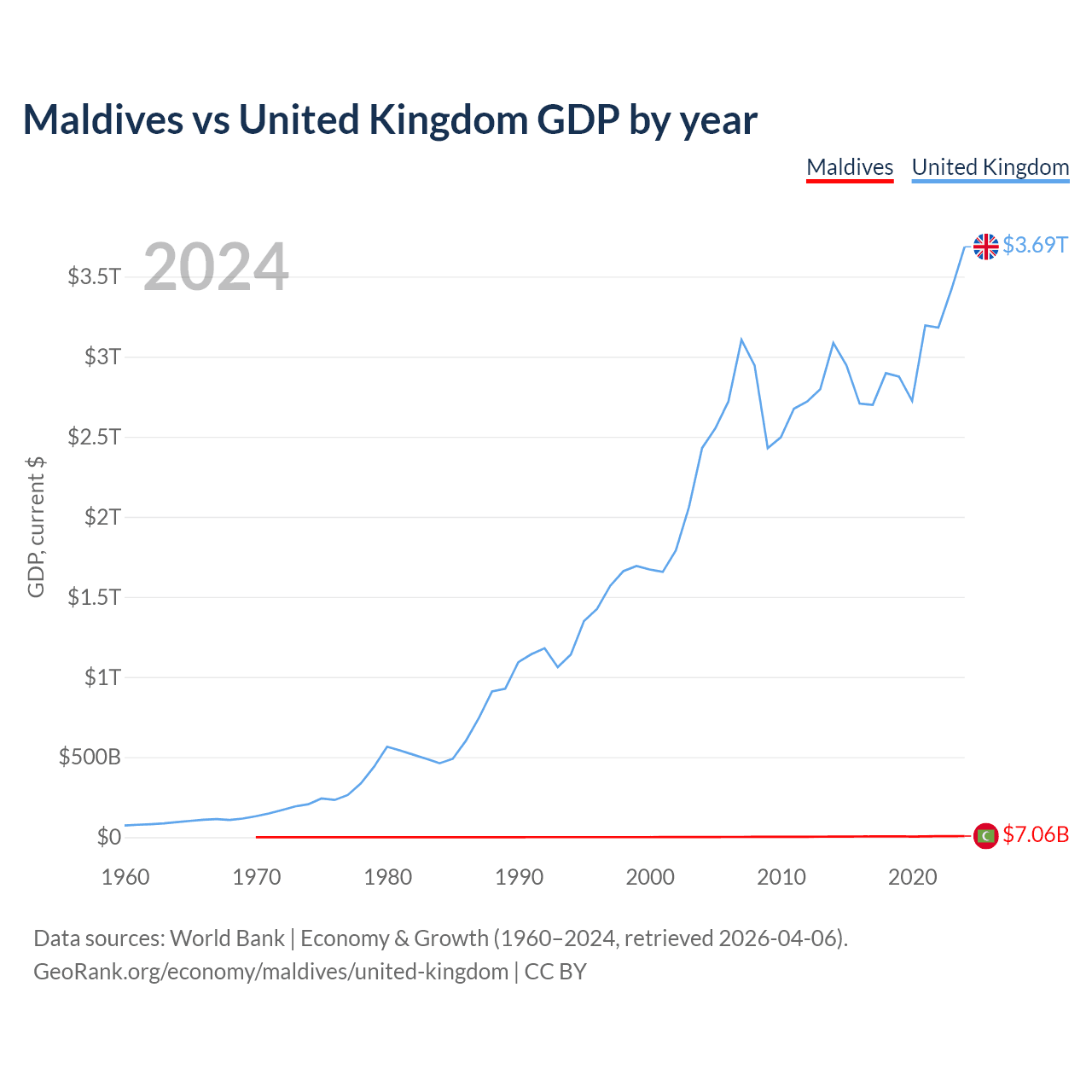Maldives has a GDP of $7.06B compared to $3.69T for the United Kingdom, ranking 159/197 and 6/197 by economy size, respectively.