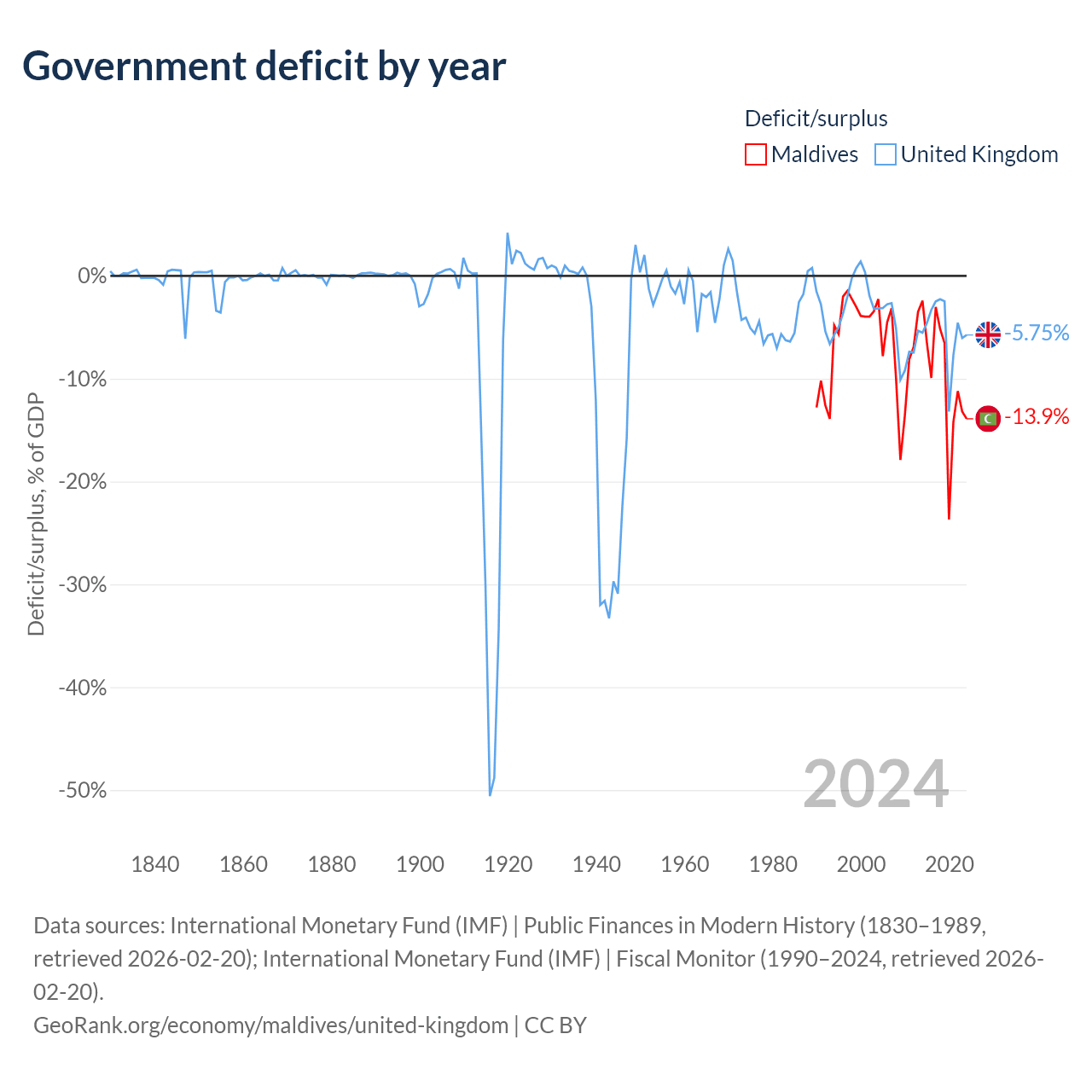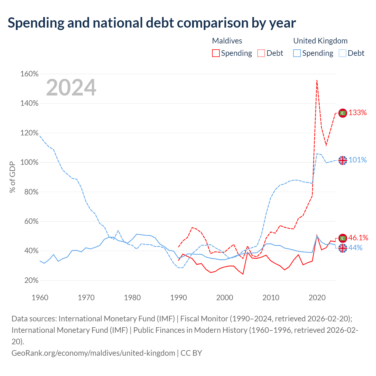 Maldives has $9.41B in government debt (133.3% of GDP), compared to $3.73T (101.2% of GDP) in the United Kingdom.