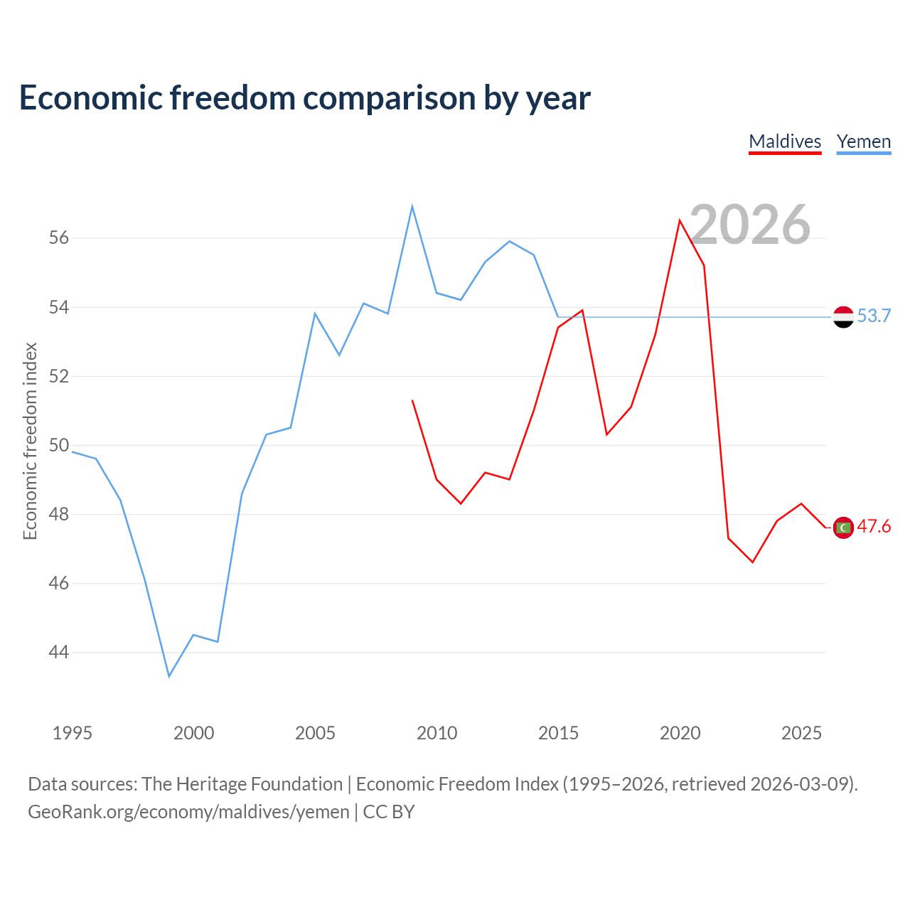 The Economic Freedom Index for Maldives is 47.6, ranking 174/197, compared to 53.7 for Yemen, ranking 138/197. The chart above displays a comparison of annual changes in economic freedom indexes.