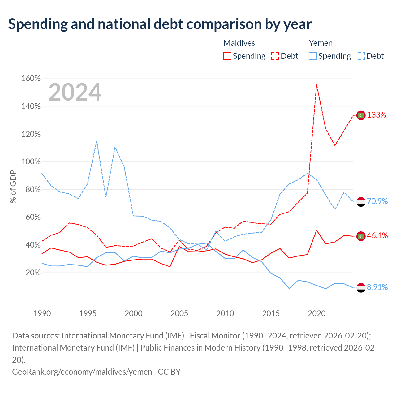 Maldives has $9.41B in government debt (133.3% of GDP), compared to $18.8B (70.9% of GDP) in Yemen.