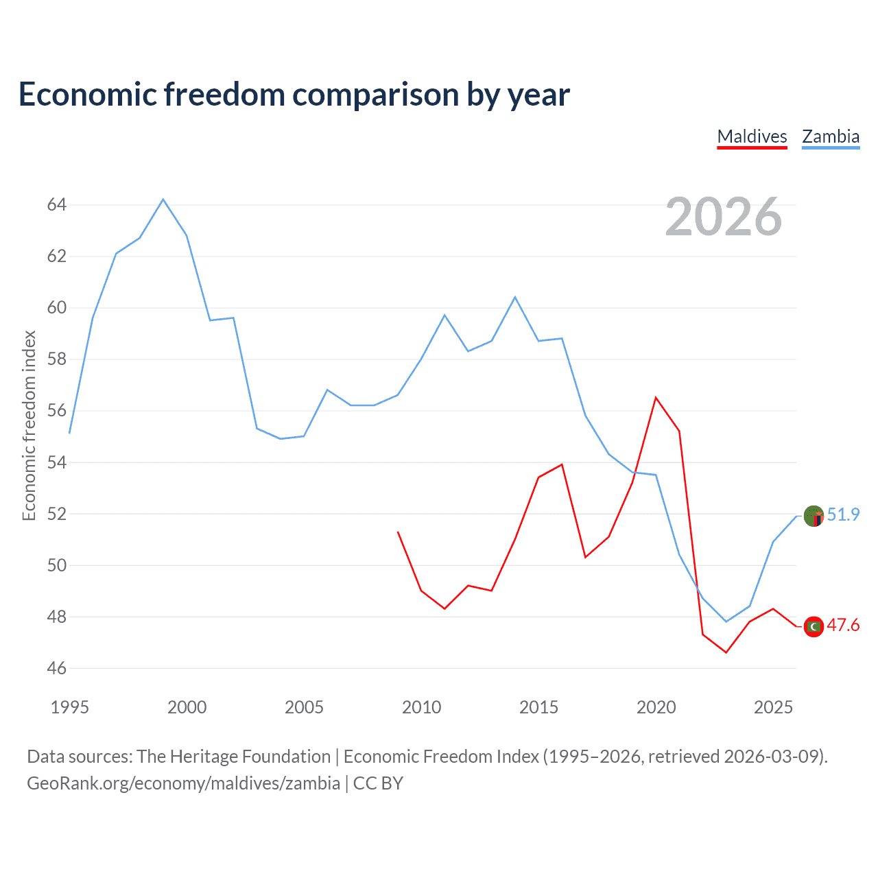 The Economic Freedom Index for Maldives is 47.6, ranking 174/197, compared to 51.9 for Zambia, ranking 152/197. The chart above displays a comparison of annual changes in economic freedom indexes.