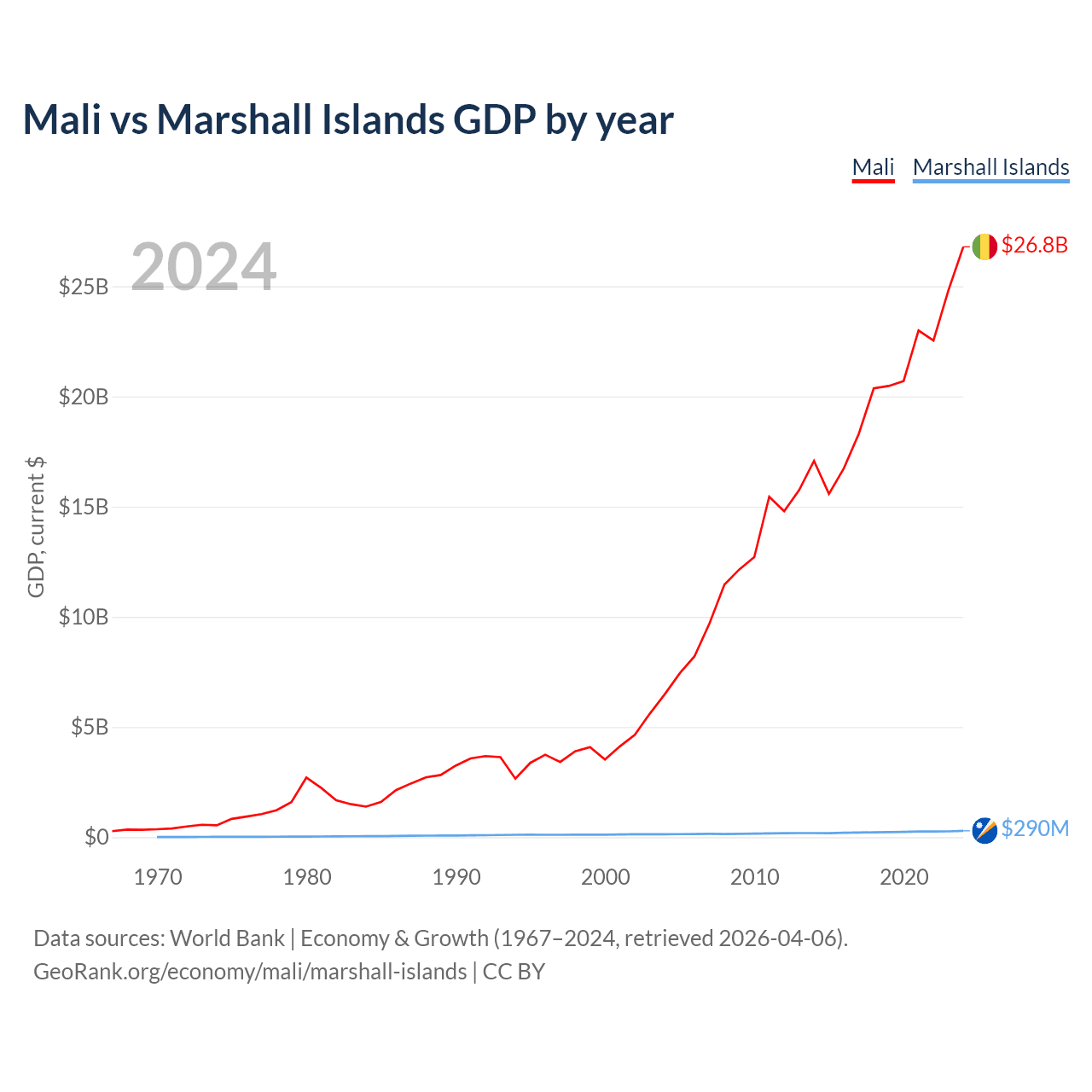 Mali has a GDP of $26.8B compared to $290M for the Marshall Islands, ranking 113/197 and 193/197 by economy size, respectively.
