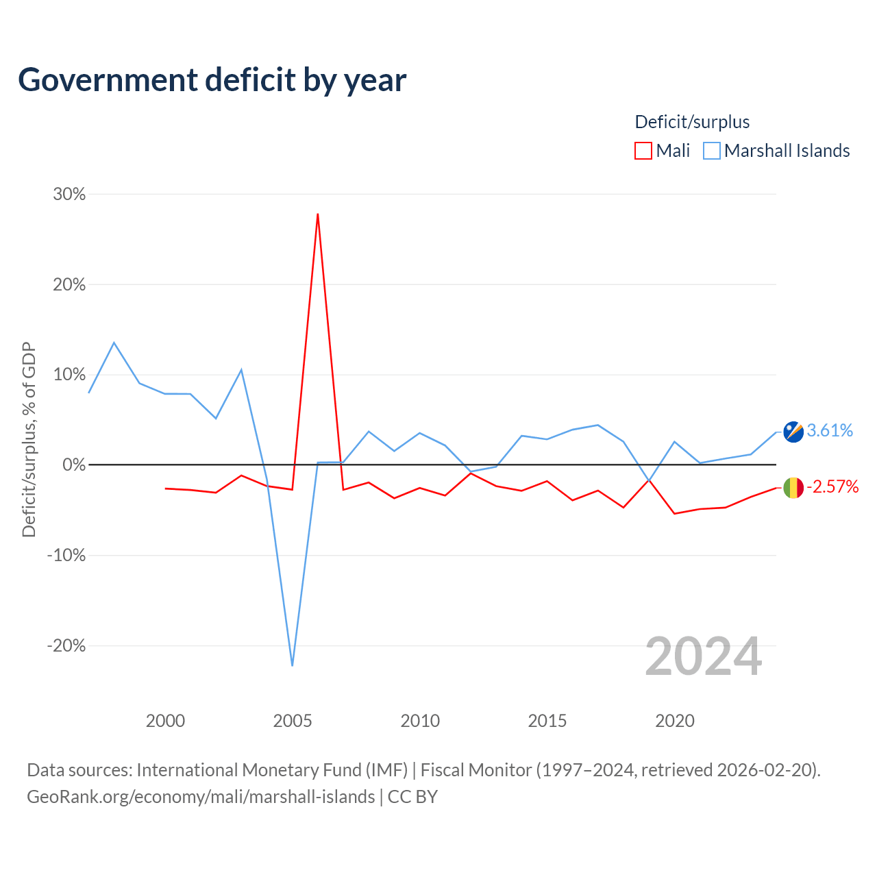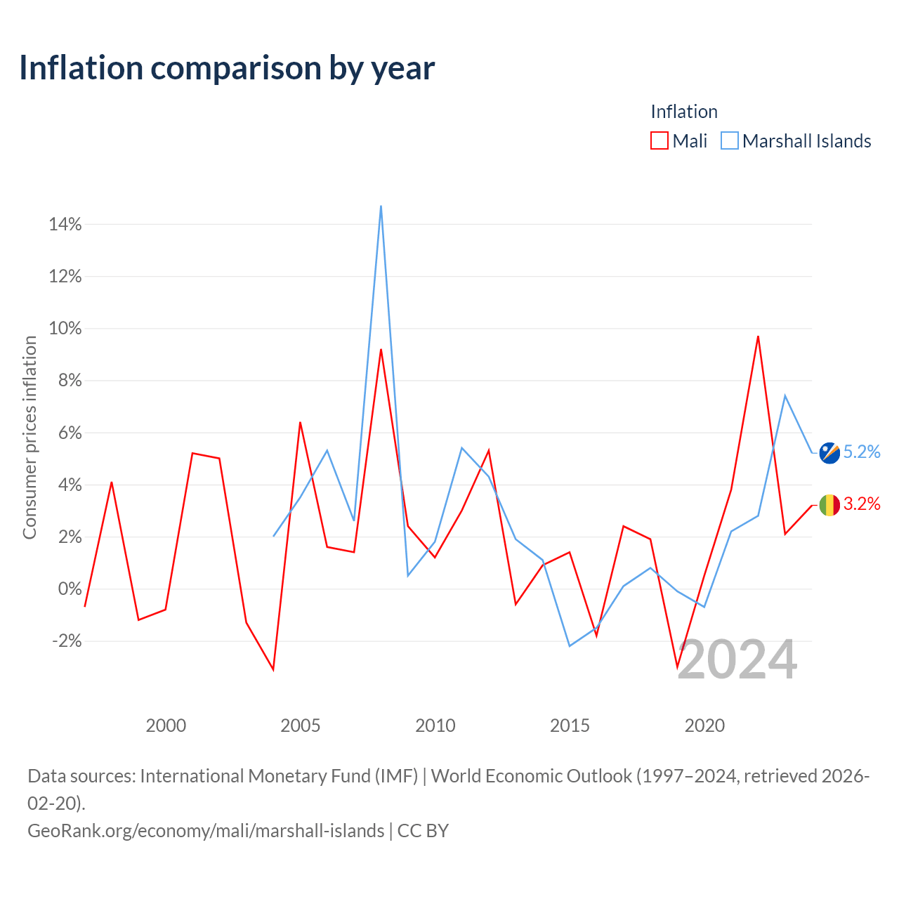 Over the past 21 years, Mali has recorded an average annual inflation rate of 2.28%, compared with 2.72% in the Marshall Islands. In 2024, inflation was 3.2% in Mali and 5.2% in the Marshall Islands.