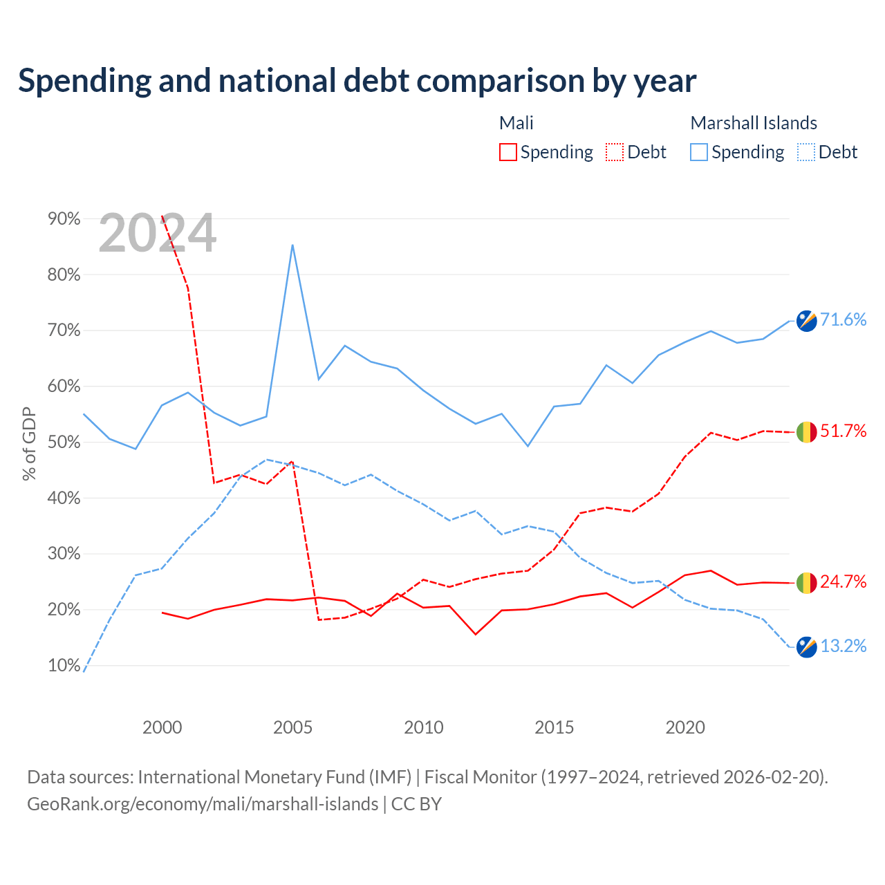 Mali has $13.9B in government debt (51.7% of GDP), compared to $38.4M (13.2% of GDP) in the Marshall Islands.