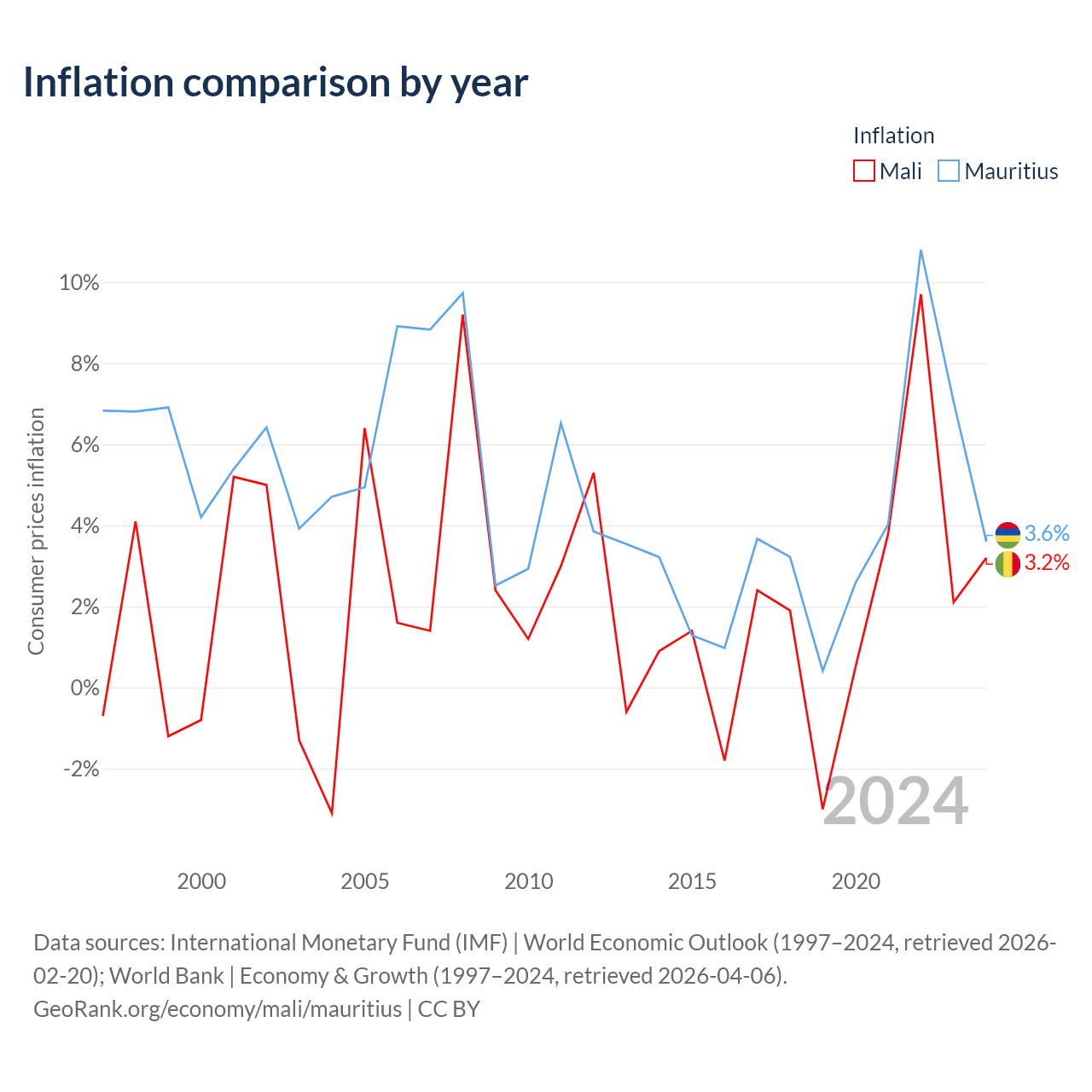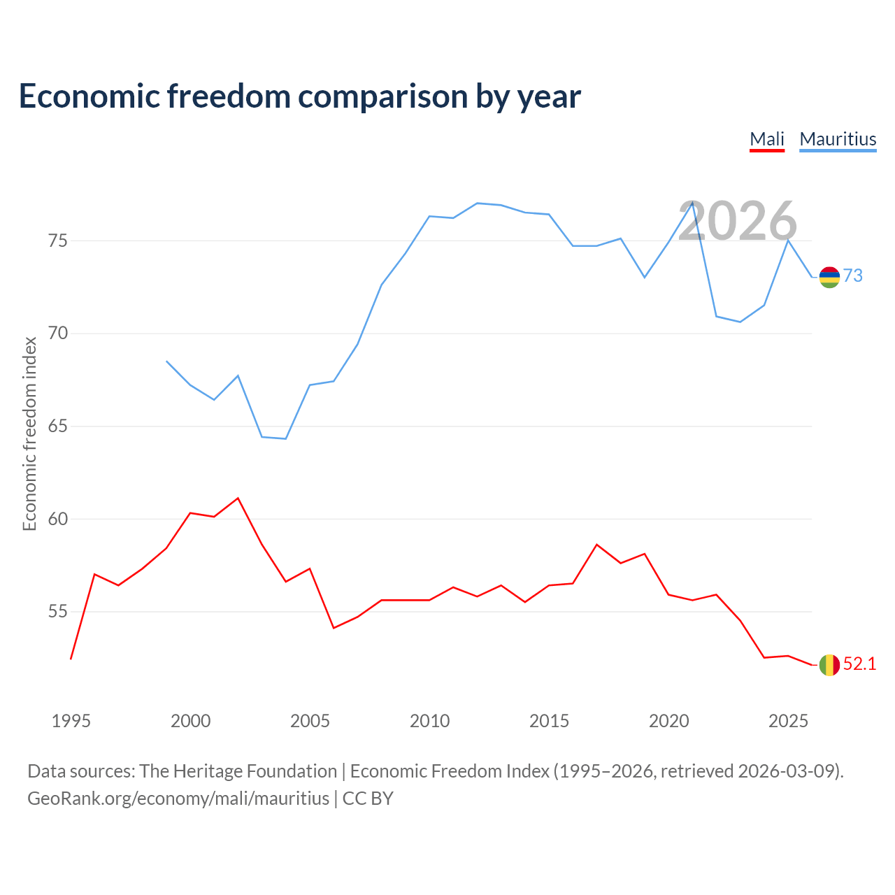 The Economic Freedom Index for Mali is 52.1, ranking 150/197, compared to 73 for Mauritius, ranking 26/197. The chart above displays a comparison of annual changes in economic freedom indexes.