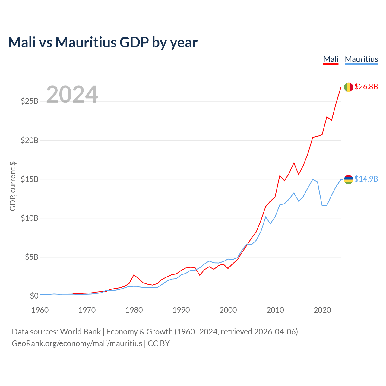 Mali has a GDP of $26.8B compared to $14.9B for Mauritius, ranking 113/197 and 143/197 by economy size, respectively.
