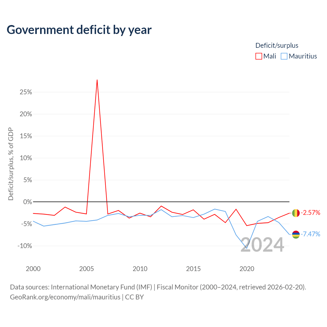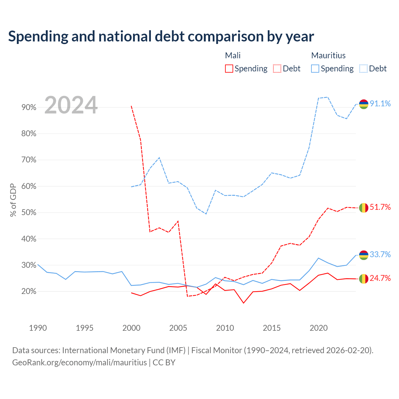 Mali has $13.9B in government debt (51.7% of GDP), compared to $13.6B (91.1% of GDP) in Mauritius.