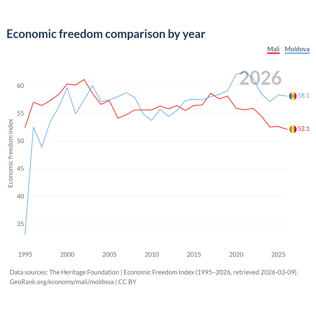 The Economic Freedom Index for Mali is 52.1, ranking 150/197, compared to 58.1 for Moldova, ranking 112/197. The chart above displays a comparison of annual changes in economic freedom indexes.