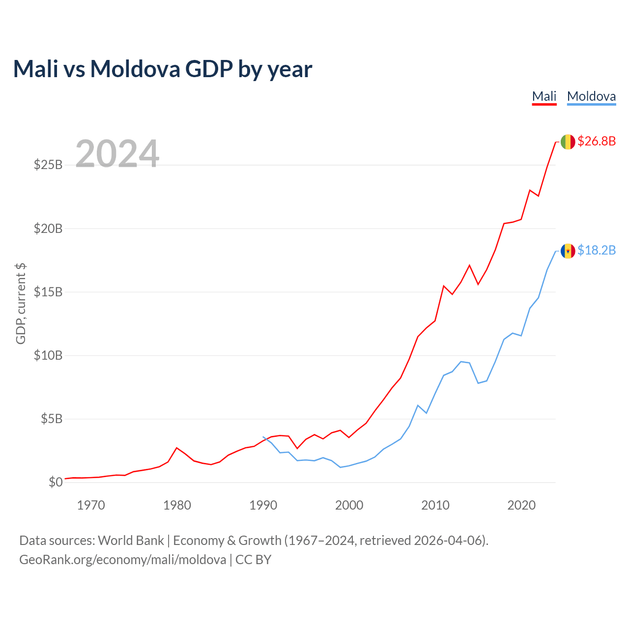 Mali has a GDP of $26.8B compared to $18.2B for Moldova, ranking 113/197 and 134/197 by economy size, respectively.