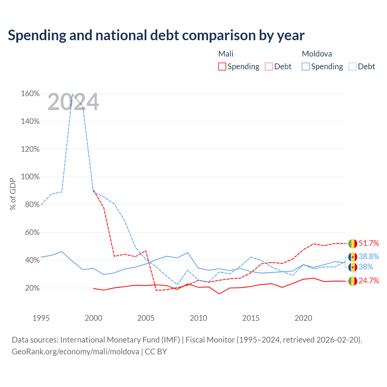 Mali has $13.9B in government debt (51.7% of GDP), compared to $7.06B (38.8% of GDP) in Moldova.