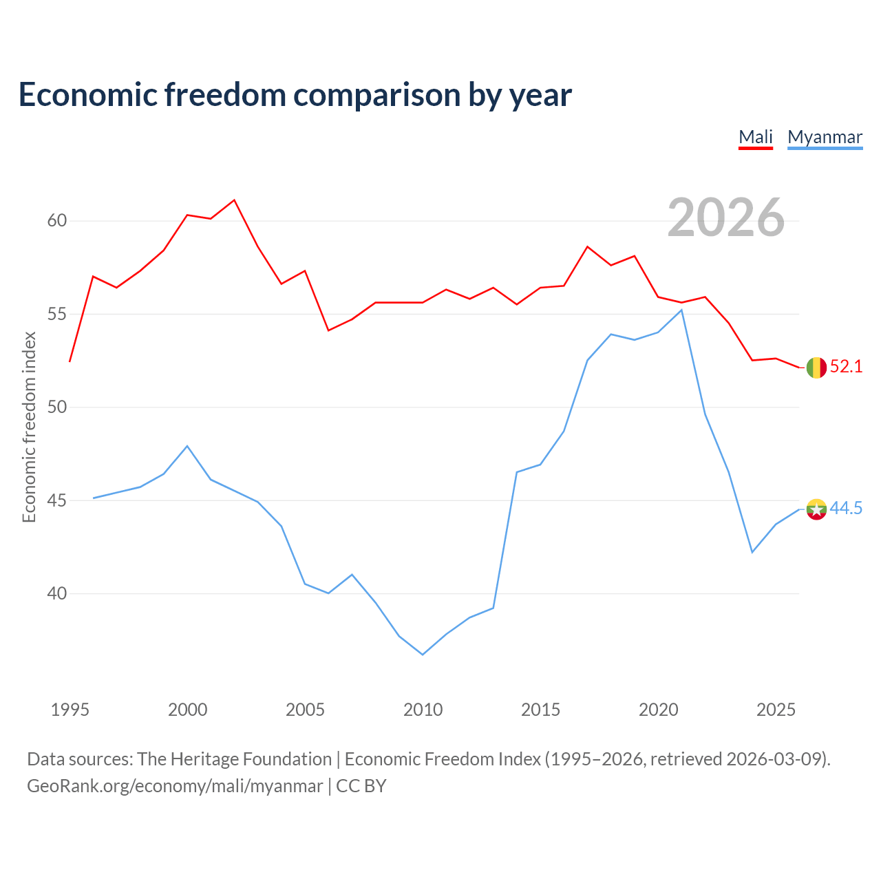 The Economic Freedom Index for Mali is 52.1, ranking 150/197, compared to 44.5 for Myanmar, ranking 180/197. The chart above displays a comparison of annual changes in economic freedom indexes.