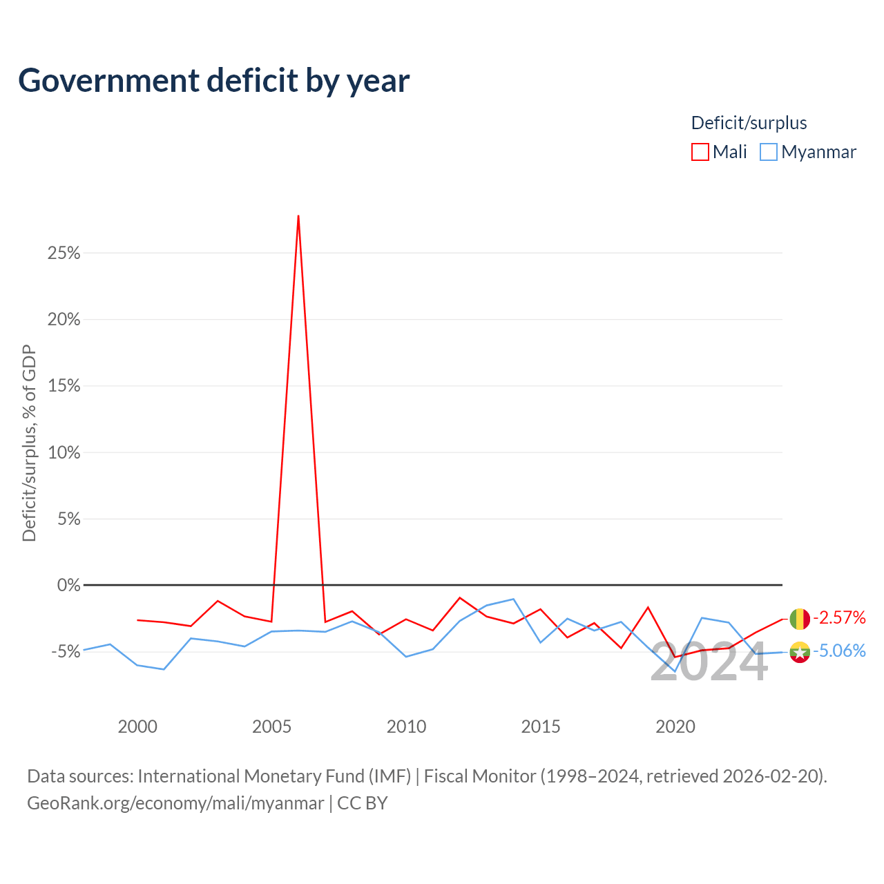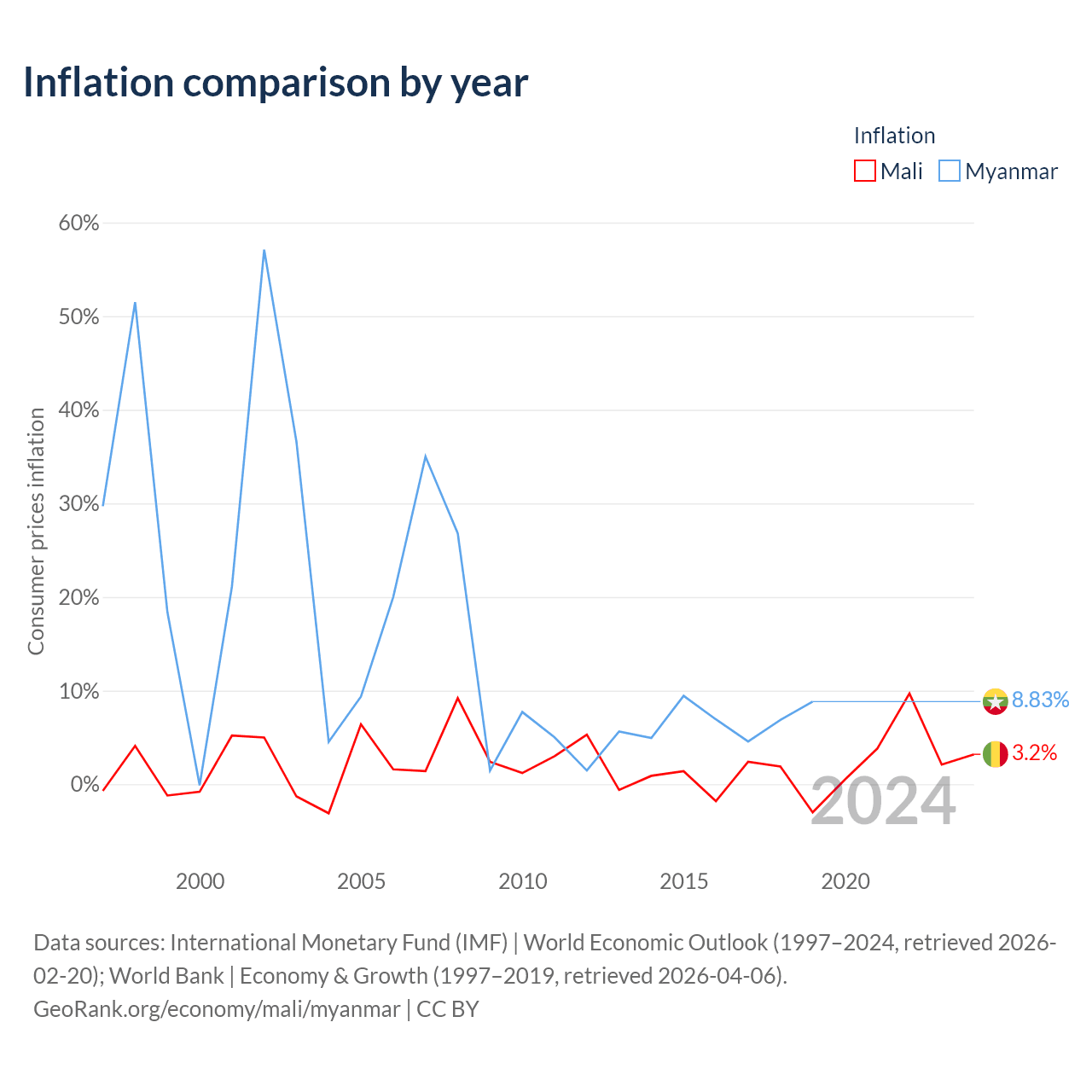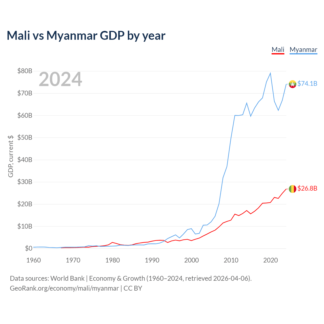 Mali has a GDP of $26.8B compared to $74.1B for Myanmar, ranking 113/197 and 85/197 by economy size, respectively.