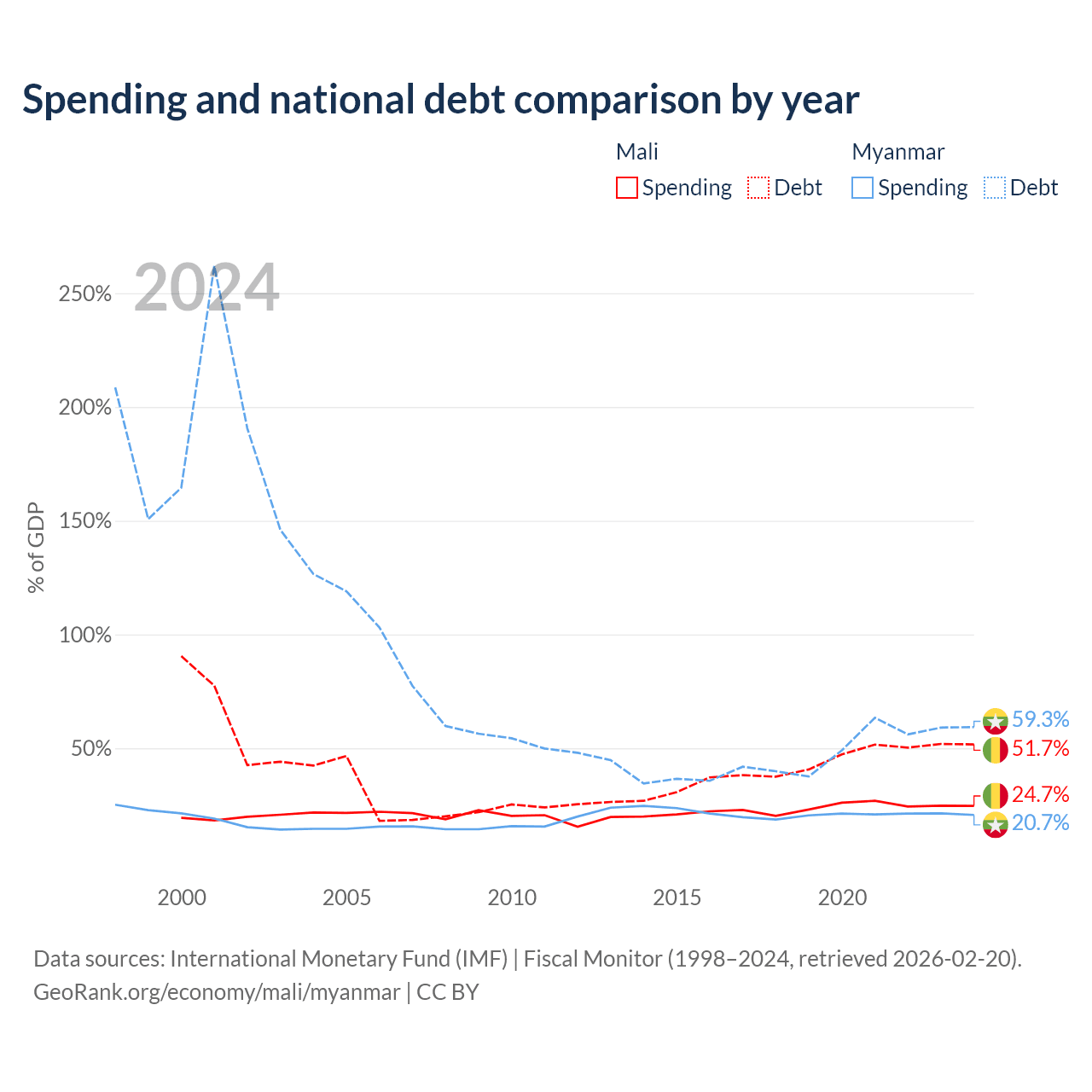 Mali has $13.9B in government debt (51.7% of GDP), compared to $44B (59.3% of GDP) in Myanmar.