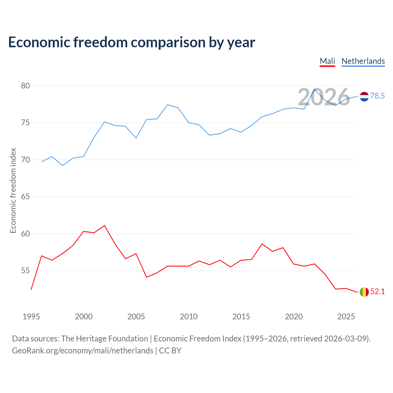 The Economic Freedom Index for Mali is 52.1, ranking 150/197, compared to 78.5 for the Netherlands, ranking 11/197. The chart above displays a comparison of annual changes in economic freedom indexes.