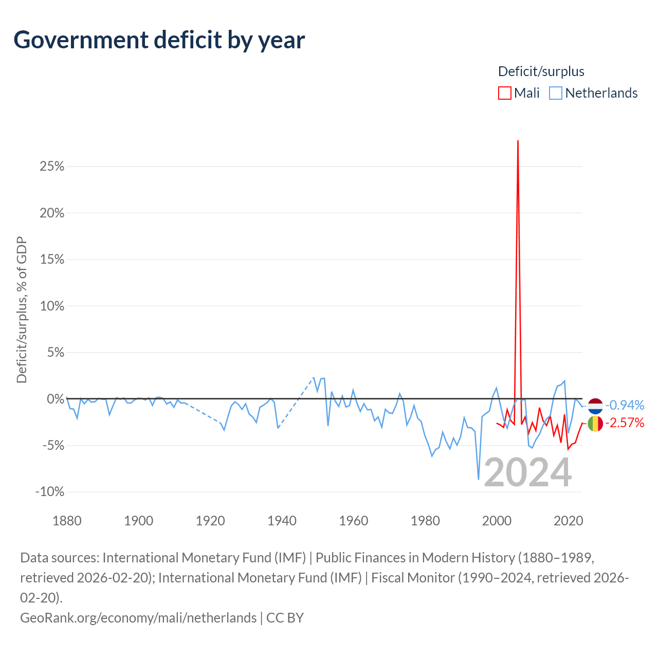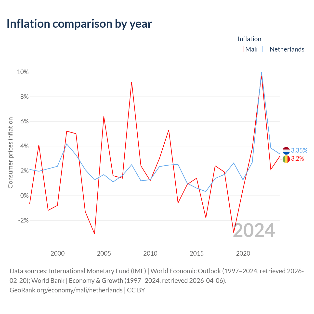 Mali has a GDP of $26.8B compared to $1.21T for the Netherlands, ranking 113/197 and 19/197 by economy size, respectively.