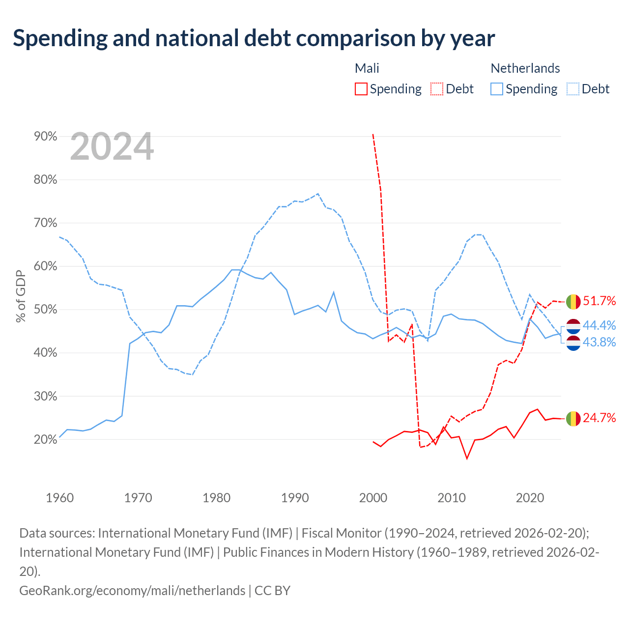 Mali has $13.9B in government debt (51.7% of GDP), compared to $532B (43.8% of GDP) in the Netherlands.
