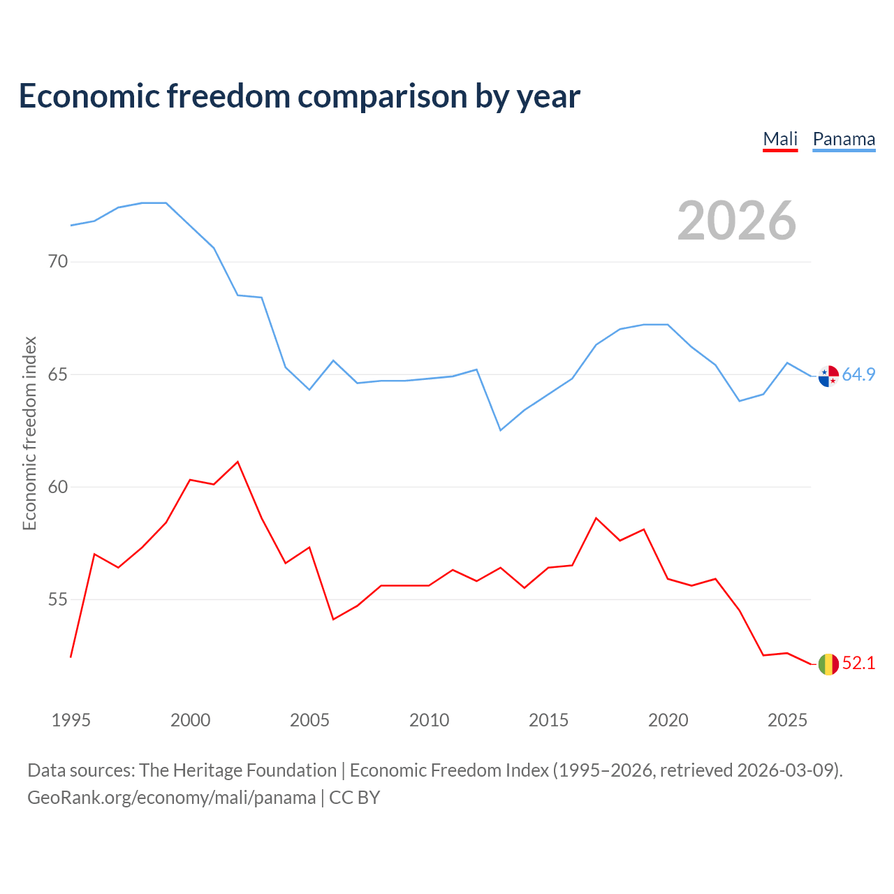 The Economic Freedom Index for Mali is 52.1, ranking 150/197, compared to 64.9 for Panama, ranking 70/197. The chart above displays a comparison of annual changes in economic freedom indexes.