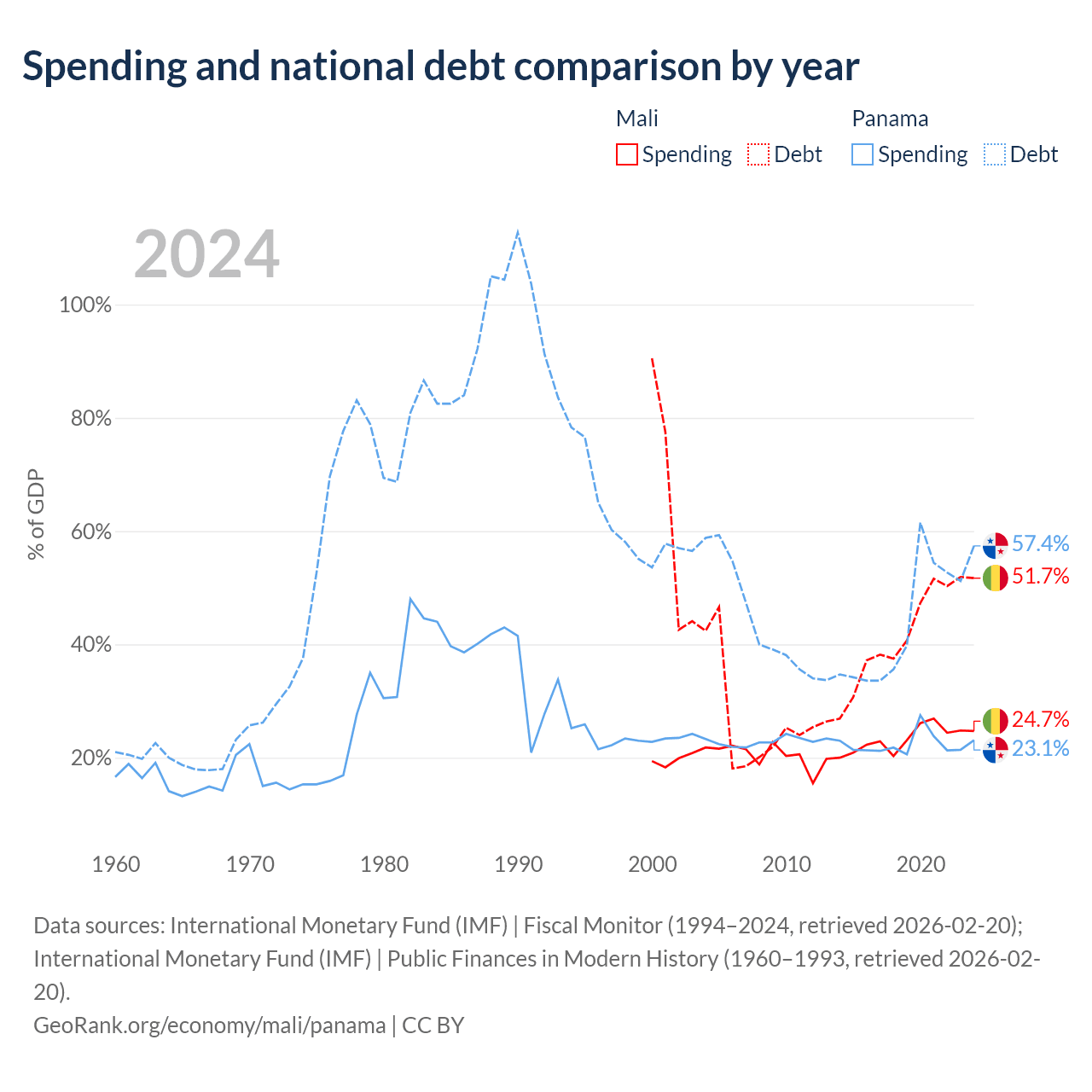 Mali has $13.9B in government debt (51.7% of GDP), compared to $49.6B (57.4% of GDP) in Panama.