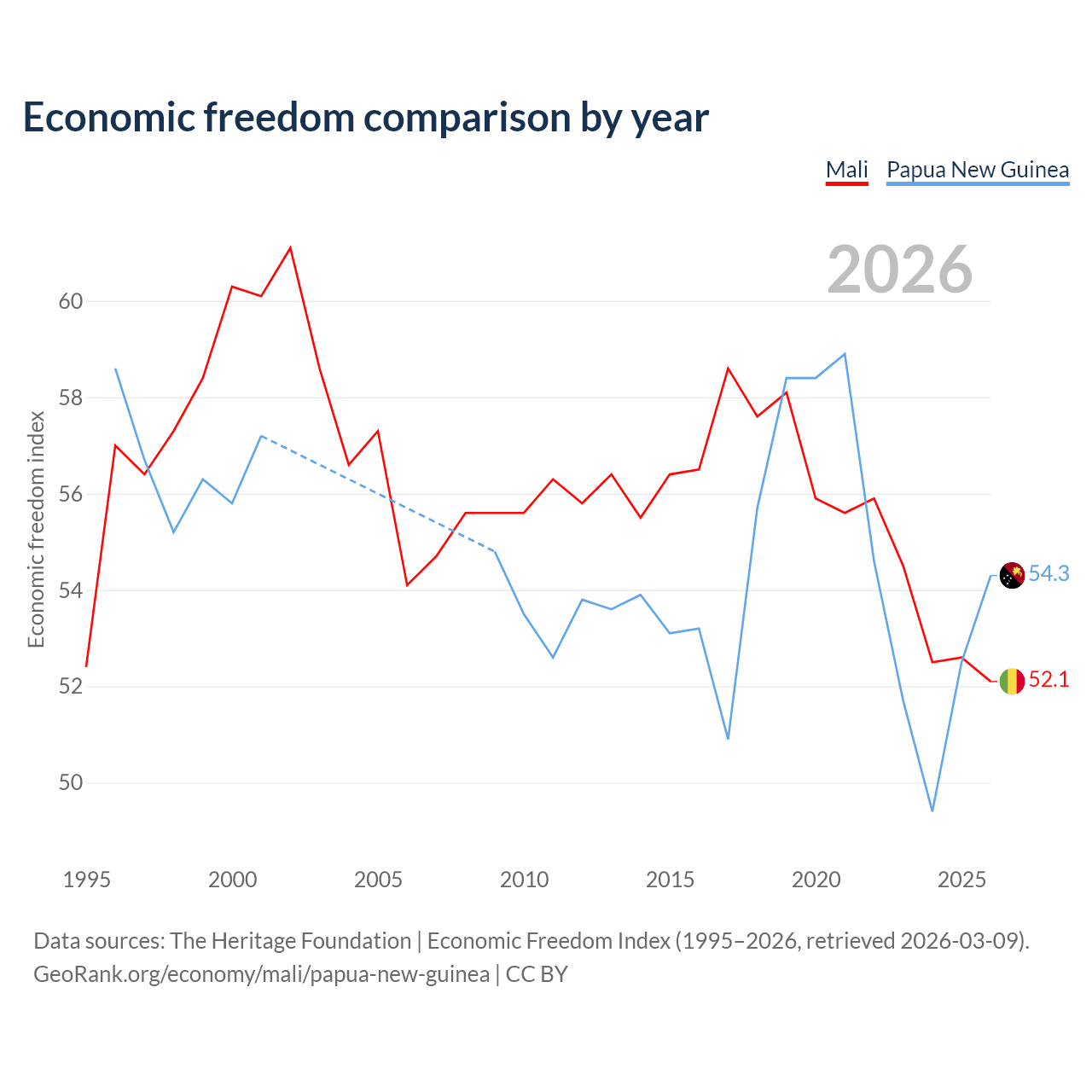 The Economic Freedom Index for Mali is 52.1, ranking 150/197, compared to 54.3 for Papua New Guinea, ranking 134/197. The chart above displays a comparison of annual changes in economic freedom indexes.