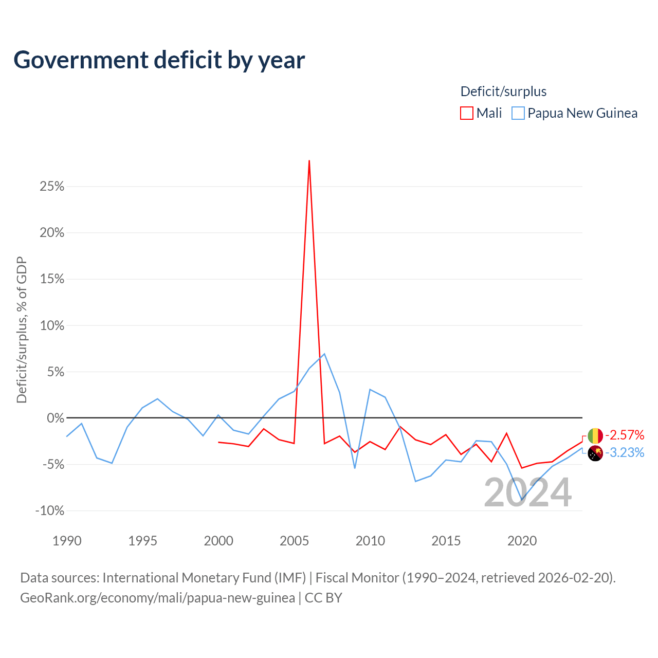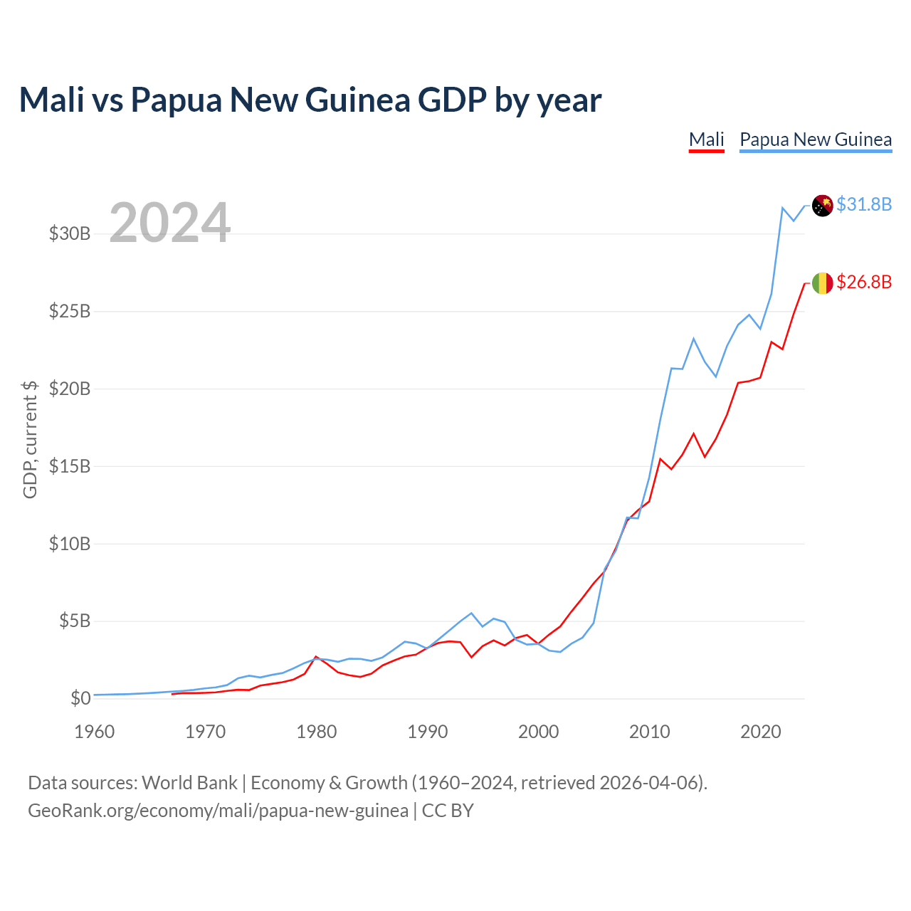 Mali has a GDP of $26.8B compared to $31.8B for Papua New Guinea, ranking 113/197 and 110/197 by economy size, respectively.