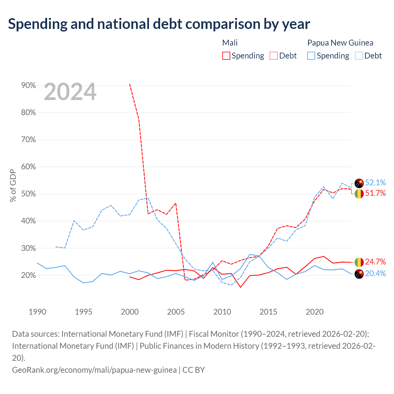 Mali has $13.9B in government debt (51.7% of GDP), compared to $16.6B (52.1% of GDP) in Papua New Guinea.