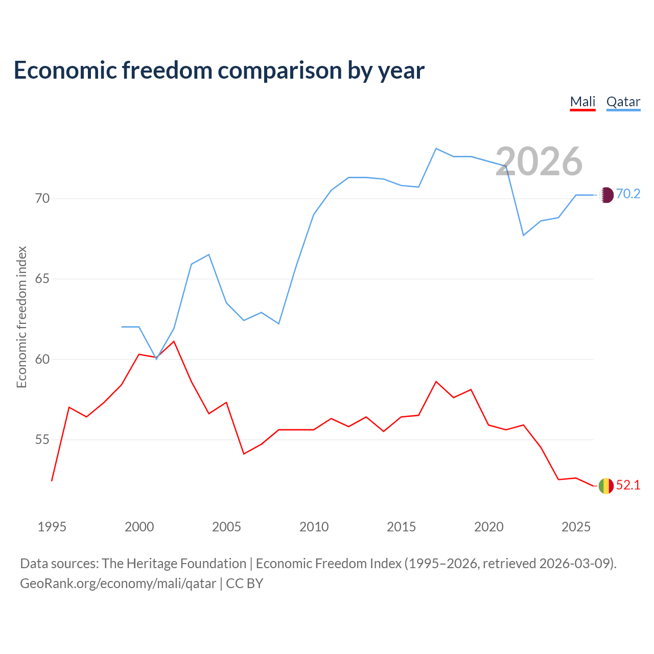The Economic Freedom Index for Mali is 52.1, ranking 150/197, compared to 70.2 for Qatar, ranking 37/197. The chart above displays a comparison of annual changes in economic freedom indexes.