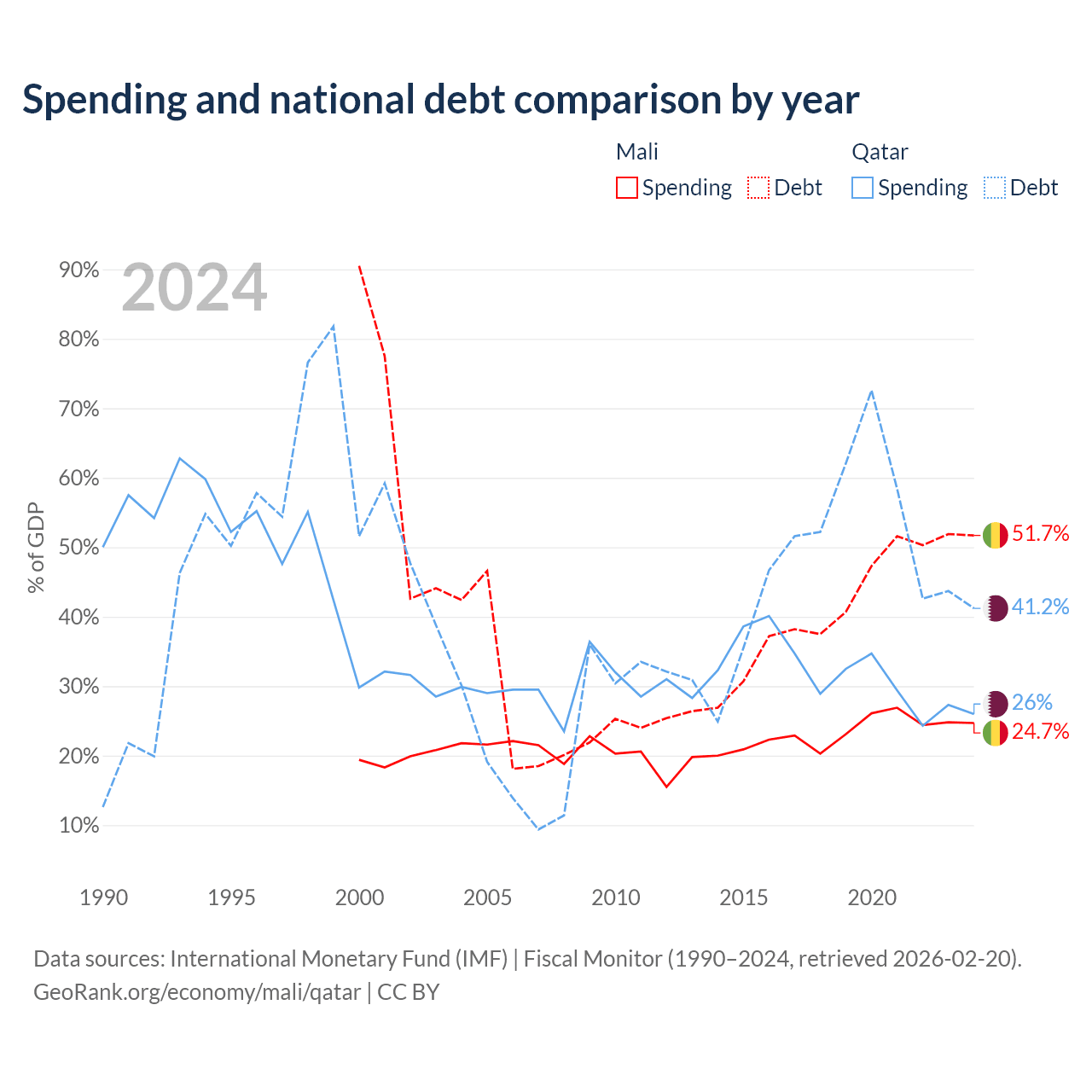 Mali has $13.9B in government debt (51.7% of GDP), compared to $90.2B (41.2% of GDP) in Qatar.