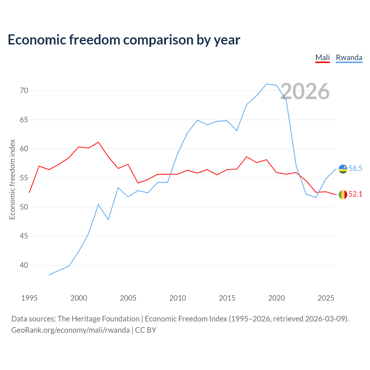 The Economic Freedom Index for Mali is 52.1, ranking 150/197, compared to 56.5 for Rwanda, ranking 121/197. The chart above displays a comparison of annual changes in economic freedom indexes.