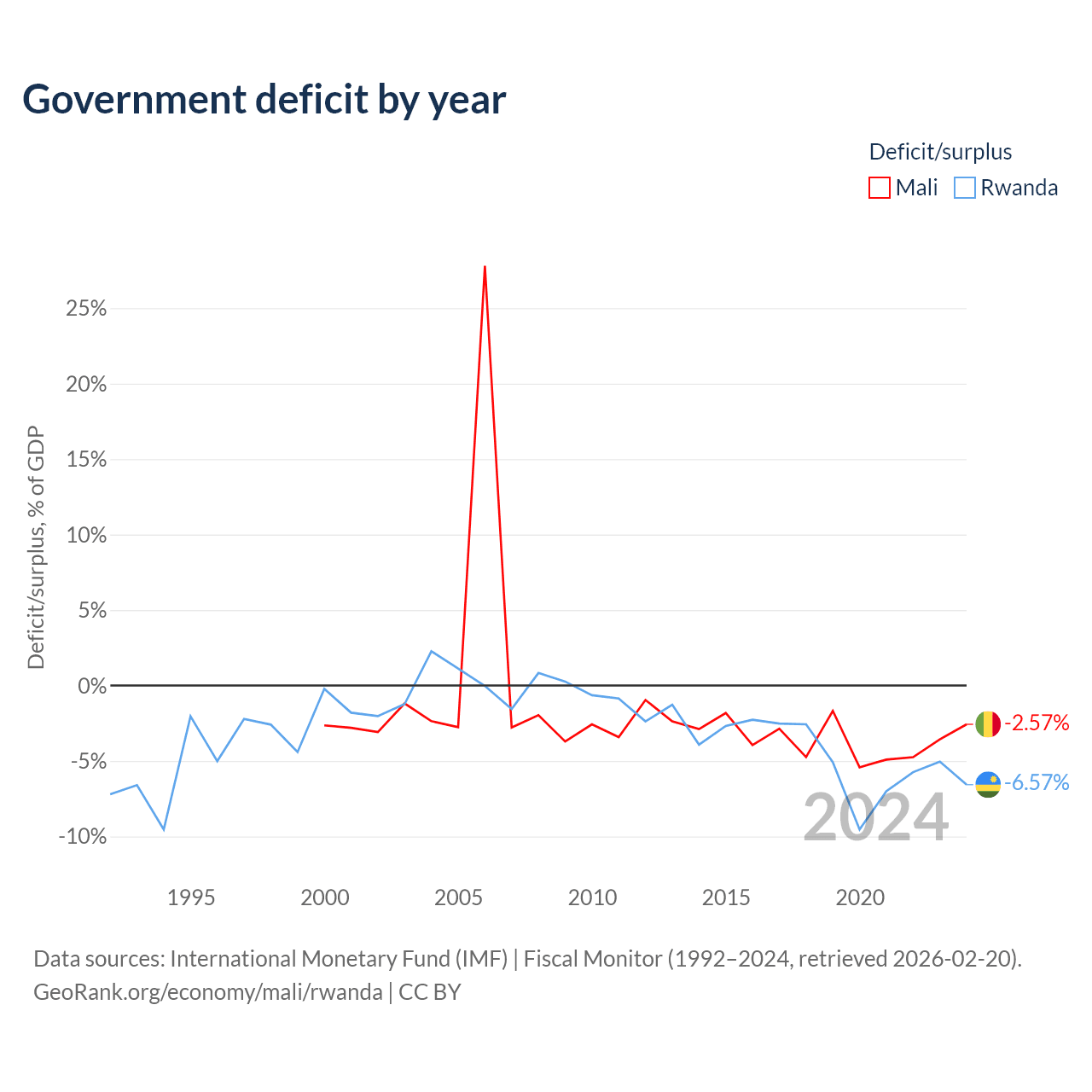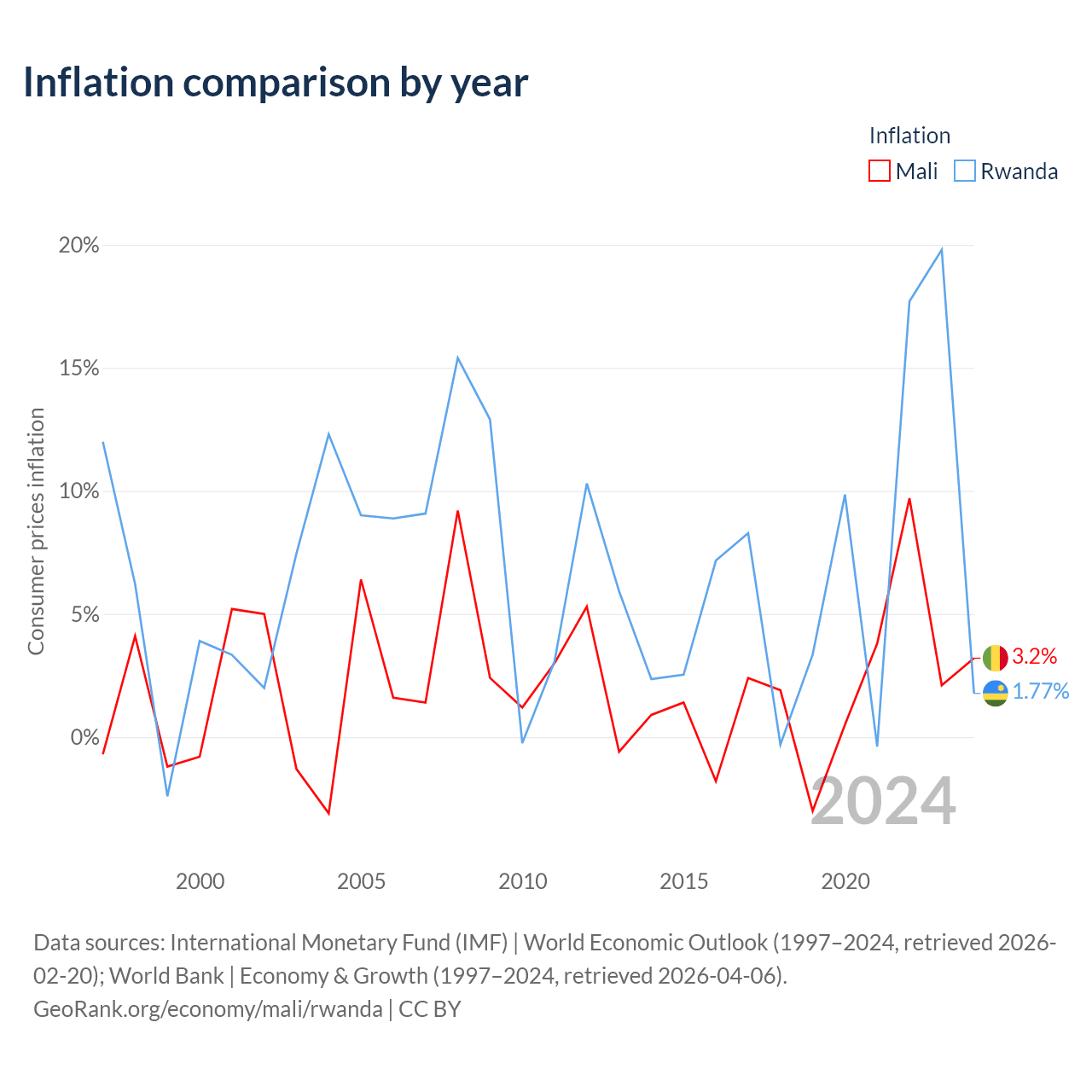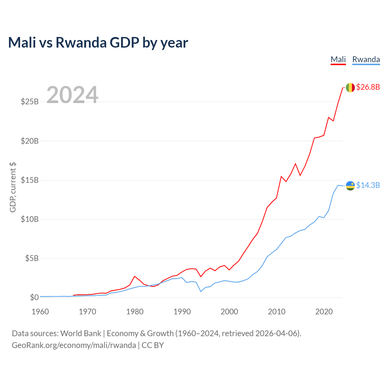 Mali has a GDP of $26.8B compared to $14.3B for Rwanda, ranking 113/197 and 144/197 by economy size, respectively.