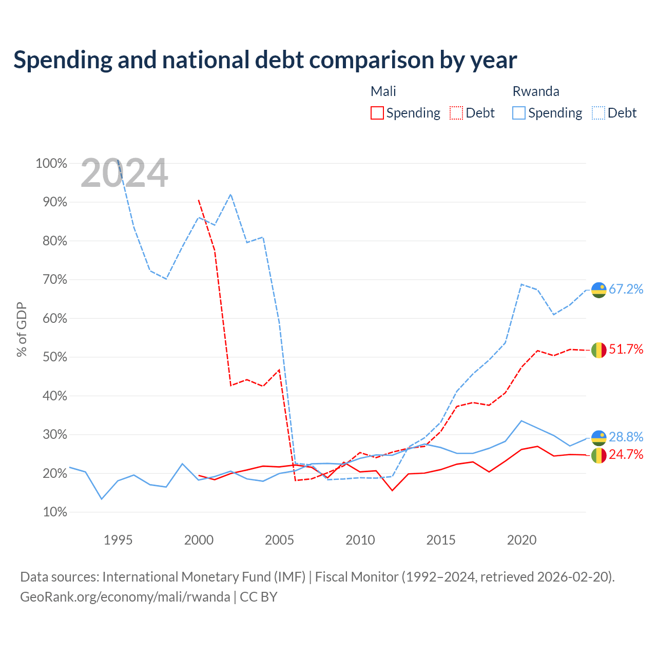 Mali has $13.9B in government debt (51.7% of GDP), compared to $9.58B (67.2% of GDP) in Rwanda.