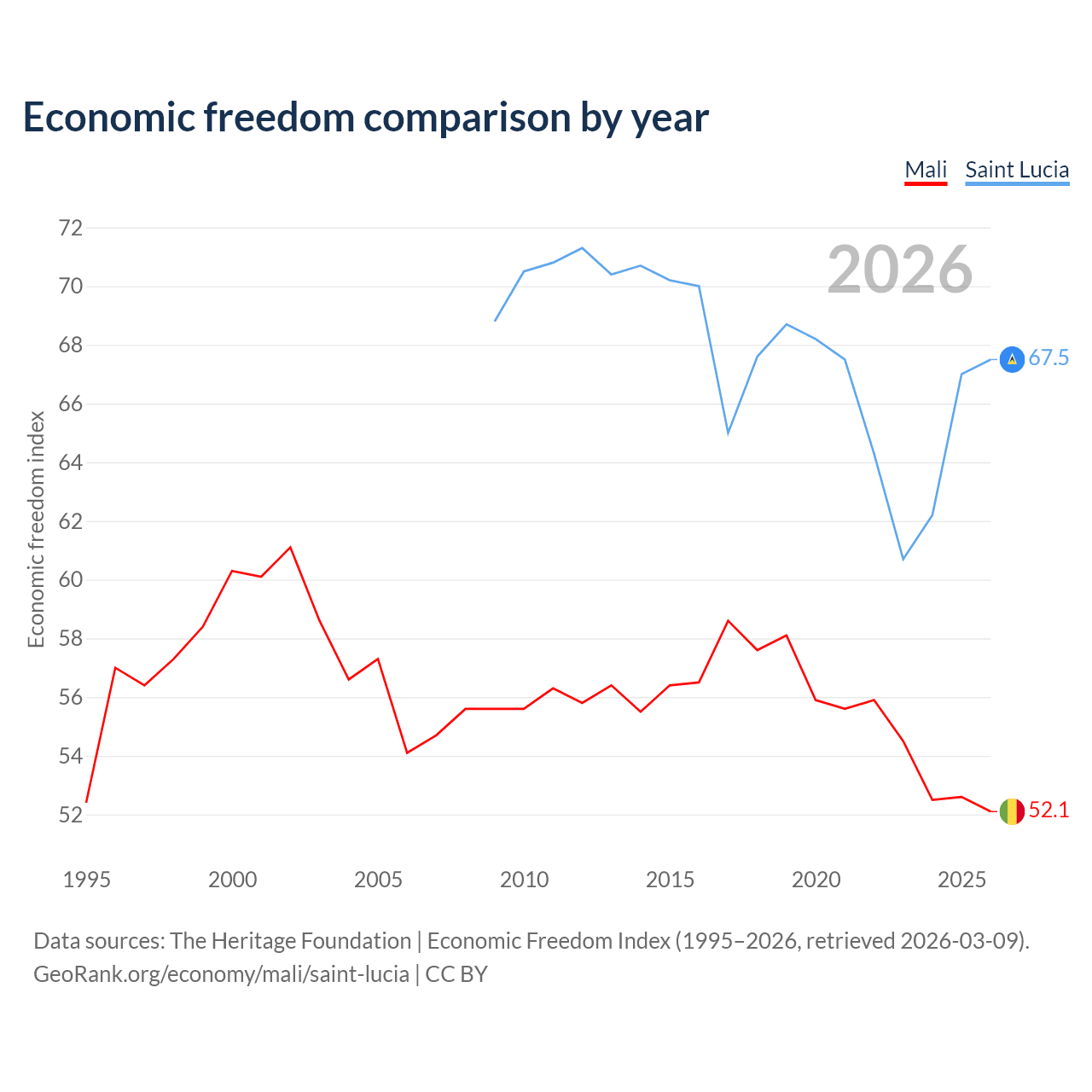 The Economic Freedom Index for Mali is 52.1, ranking 150/197, compared to 67.5 for Saint Lucia, ranking 57/197. The chart above displays a comparison of annual changes in economic freedom indexes.