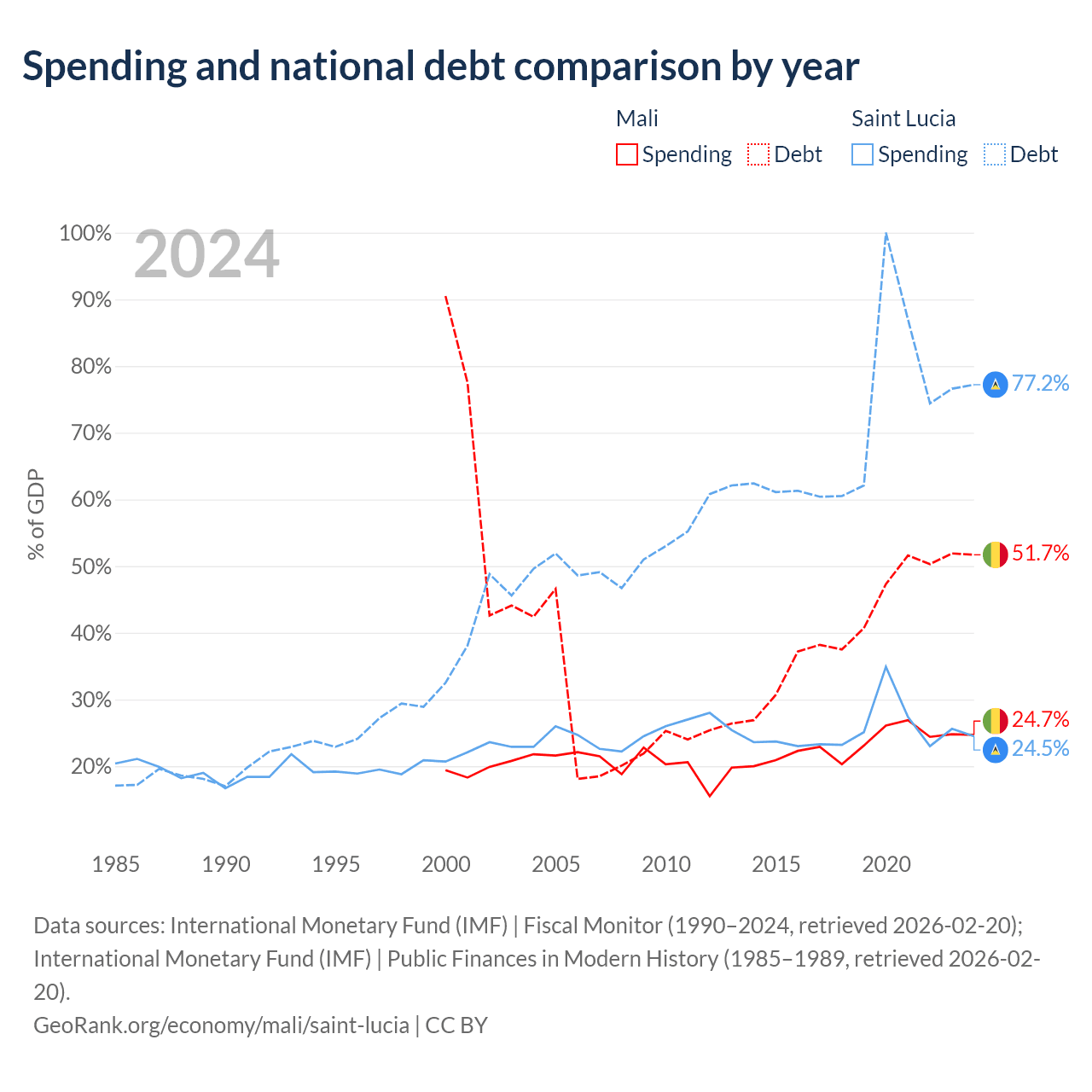 Mali has $13.9B in government debt (51.7% of GDP), compared to $1.97B (77.2% of GDP) in Saint Lucia.