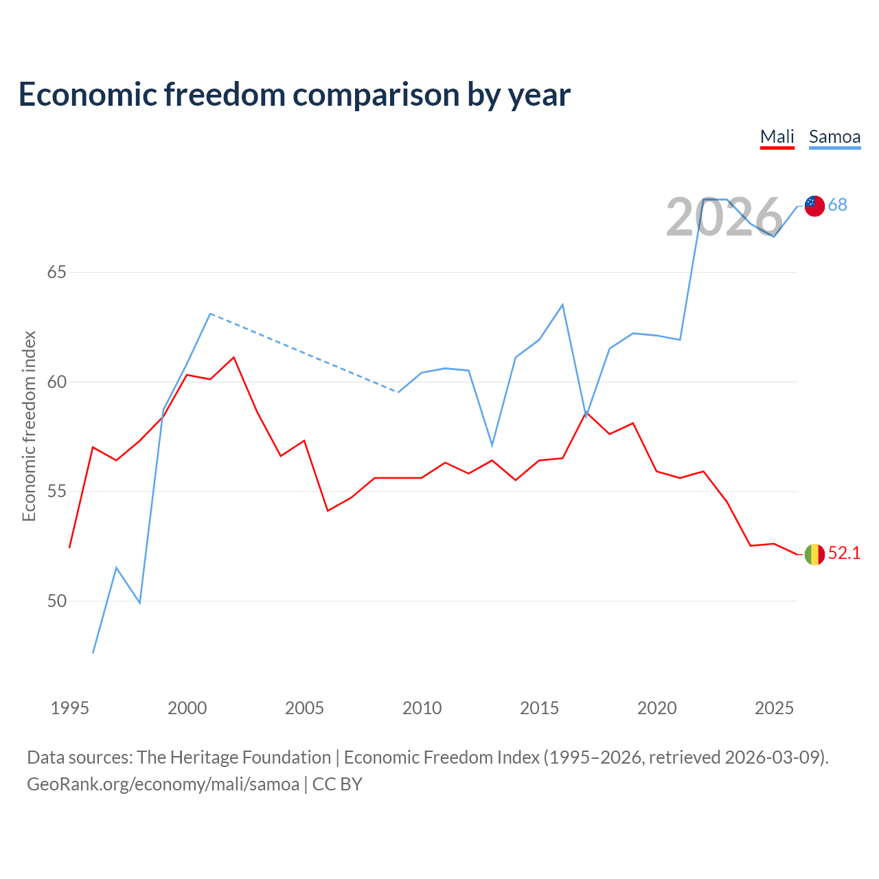 The Economic Freedom Index for Mali is 52.1, ranking 150/197, compared to 68 for Samoa, ranking 52/197. The chart above displays a comparison of annual changes in economic freedom indexes.