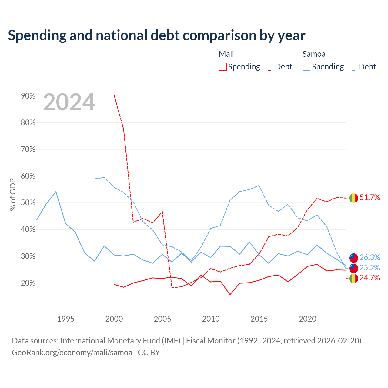 Mali has $13.9B in government debt (51.7% of GDP), compared to $296M (25.2% of GDP) in Samoa.