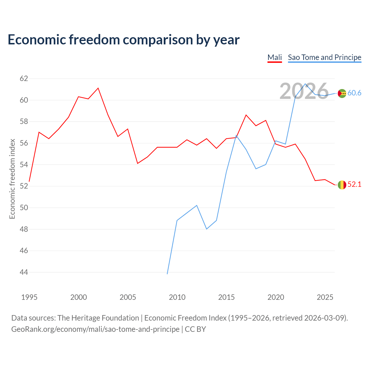 The Economic Freedom Index for Mali is 52.1, ranking 150/197, compared to 60.6 for Sao Tome and Principe, ranking 93/197. The chart above displays a comparison of annual changes in economic freedom indexes.