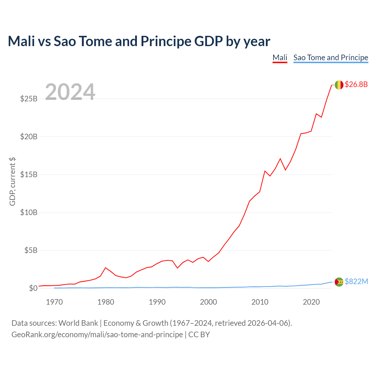 Mali has a GDP of $26.8B compared to $822M for Sao Tome and Principe, ranking 113/197 and 189/197 by economy size, respectively.