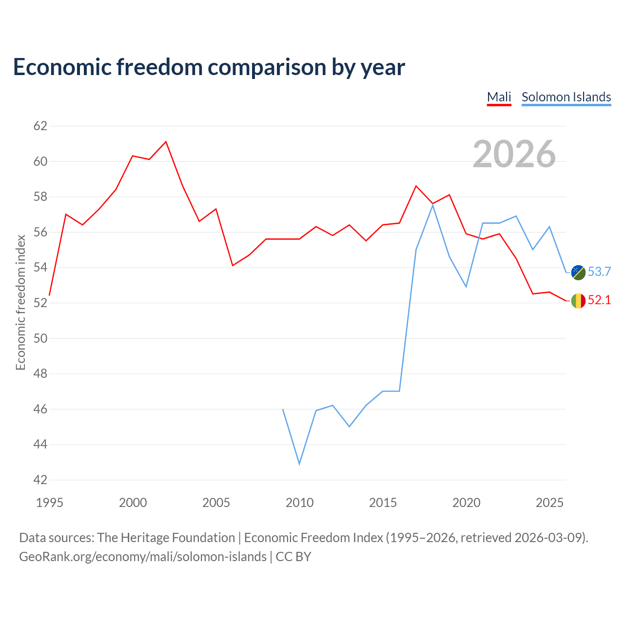 The Economic Freedom Index for Mali is 52.1, ranking 150/197, compared to 53.7 for the Solomon Islands, ranking 137/197. The chart above displays a comparison of annual changes in economic freedom indexes.