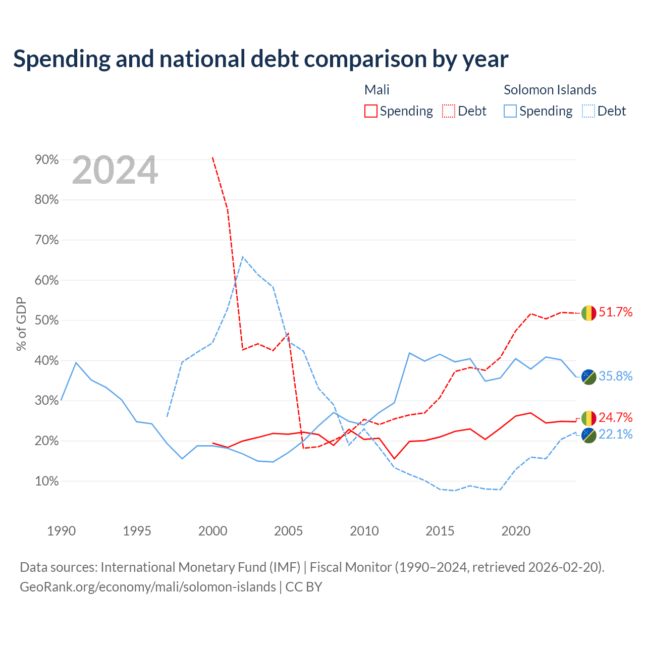 Mali has $13.9B in government debt (51.7% of GDP), compared to $350M (22.1% of GDP) in the Solomon Islands.