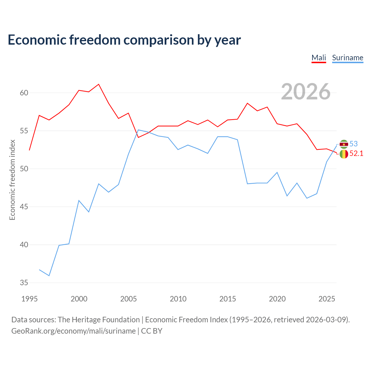The Economic Freedom Index for Mali is 52.1, ranking 150/197, compared to 53 for Suriname, ranking 143/197. The chart above displays a comparison of annual changes in economic freedom indexes.