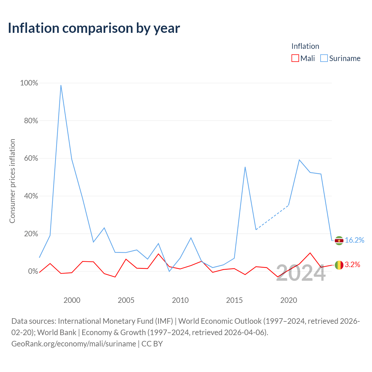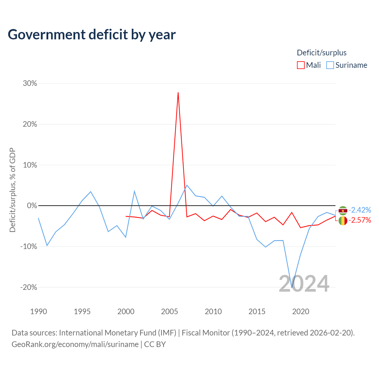 Mali has a GDP of $26.8B compared to $4.42B for Suriname, ranking 113/197 and 164/197 by economy size, respectively.