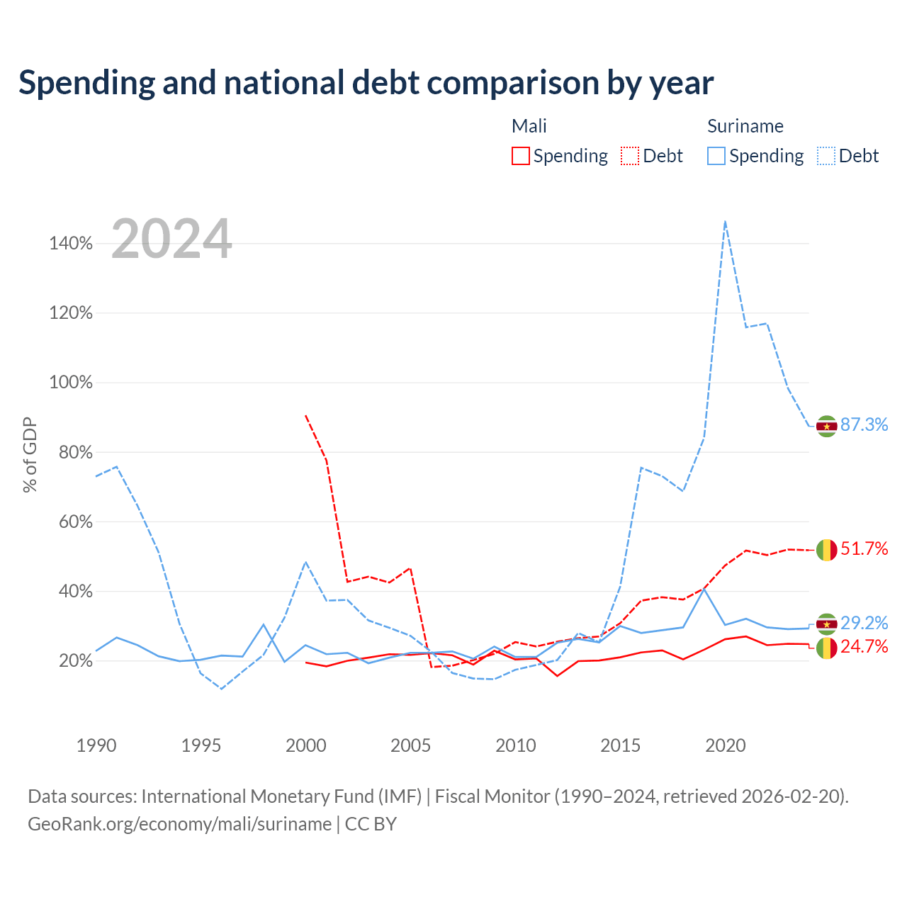 Mali has $13.9B in government debt (51.7% of GDP), compared to $3.86B (87.3% of GDP) in Suriname.