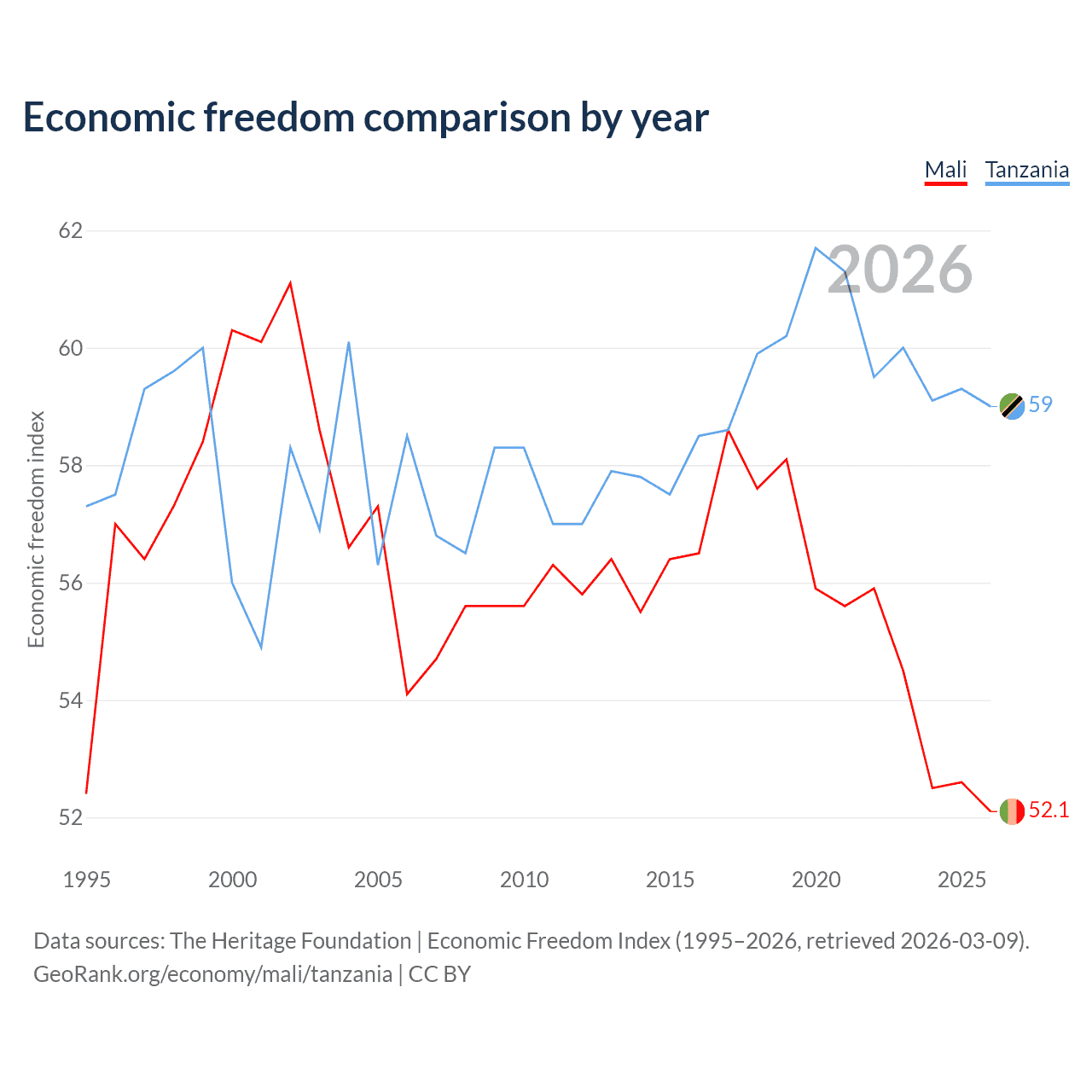 The Economic Freedom Index for Mali is 52.1, ranking 150/197, compared to 59 for Tanzania, ranking 106/197. The chart above displays a comparison of annual changes in economic freedom indexes.