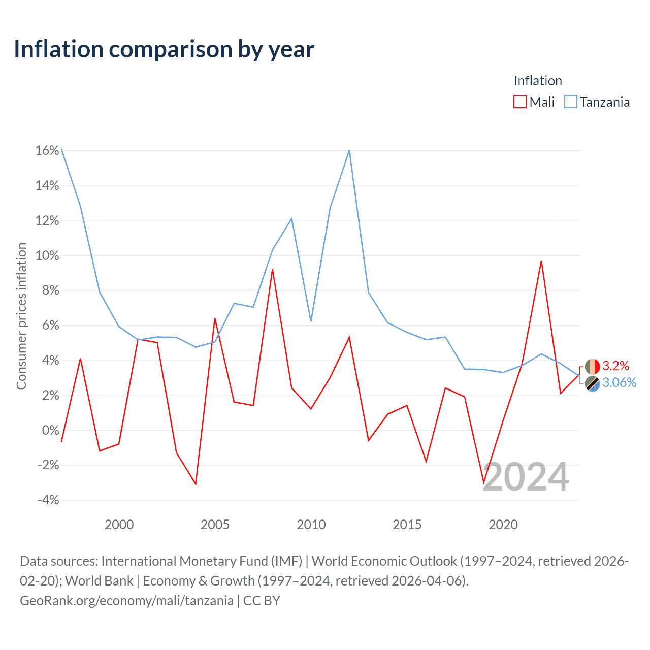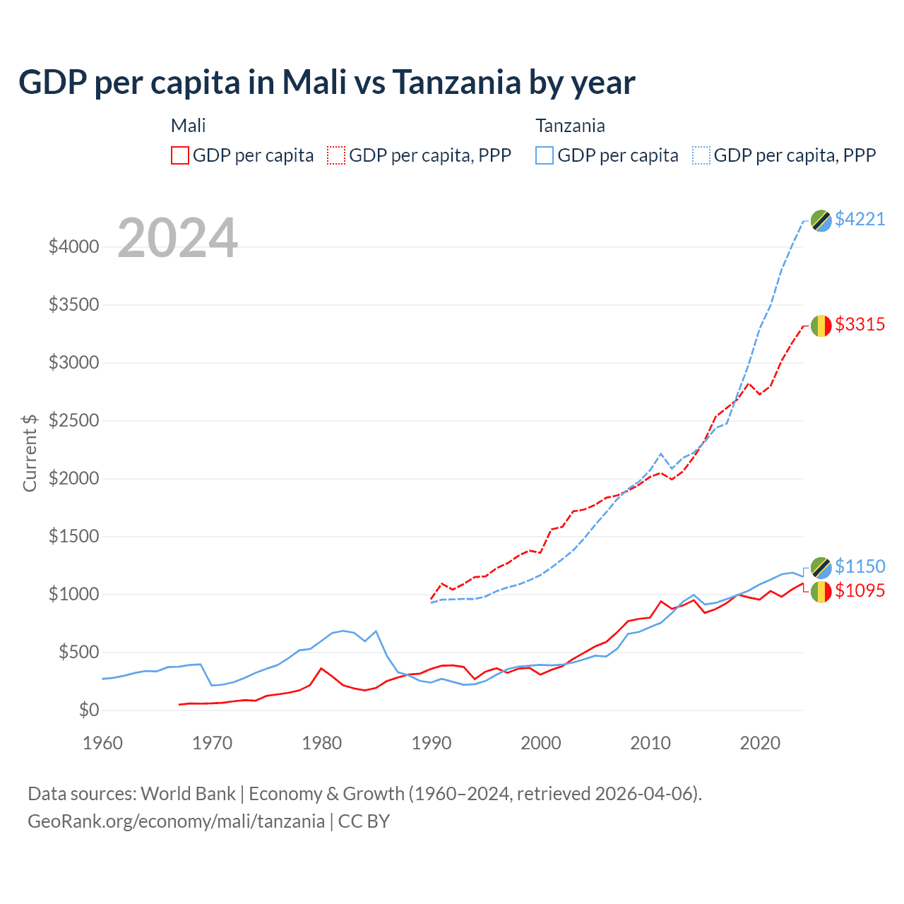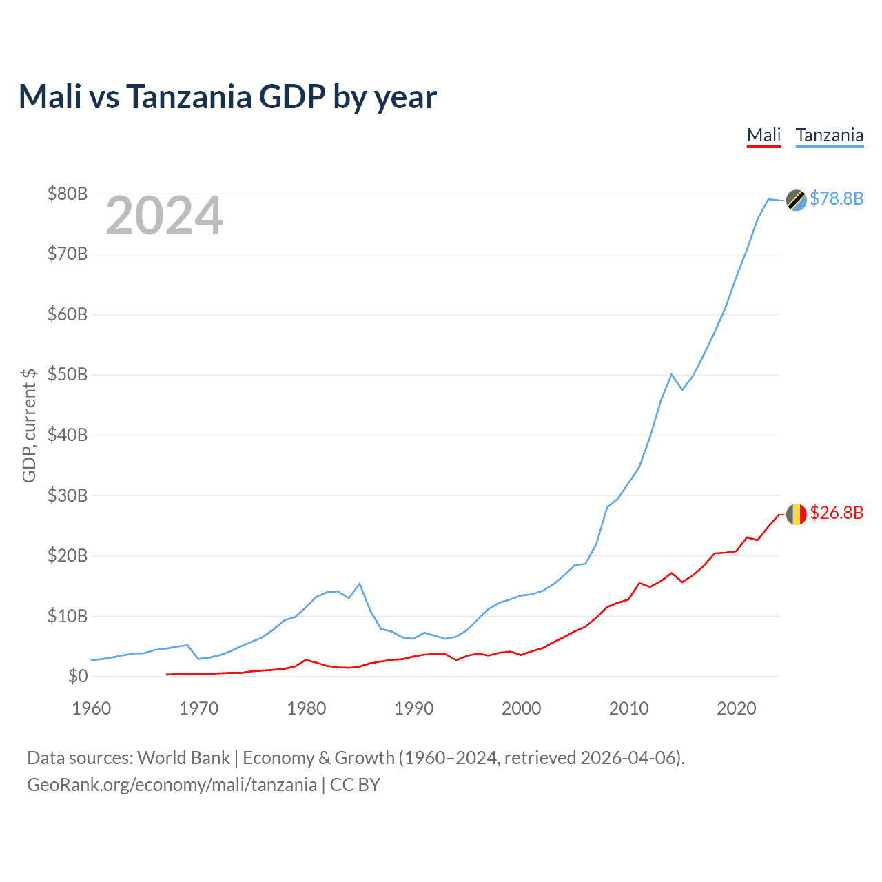Mali has a GDP of $26.8B compared to $78.8B for Tanzania, ranking 113/197 and 82/197 by economy size, respectively.