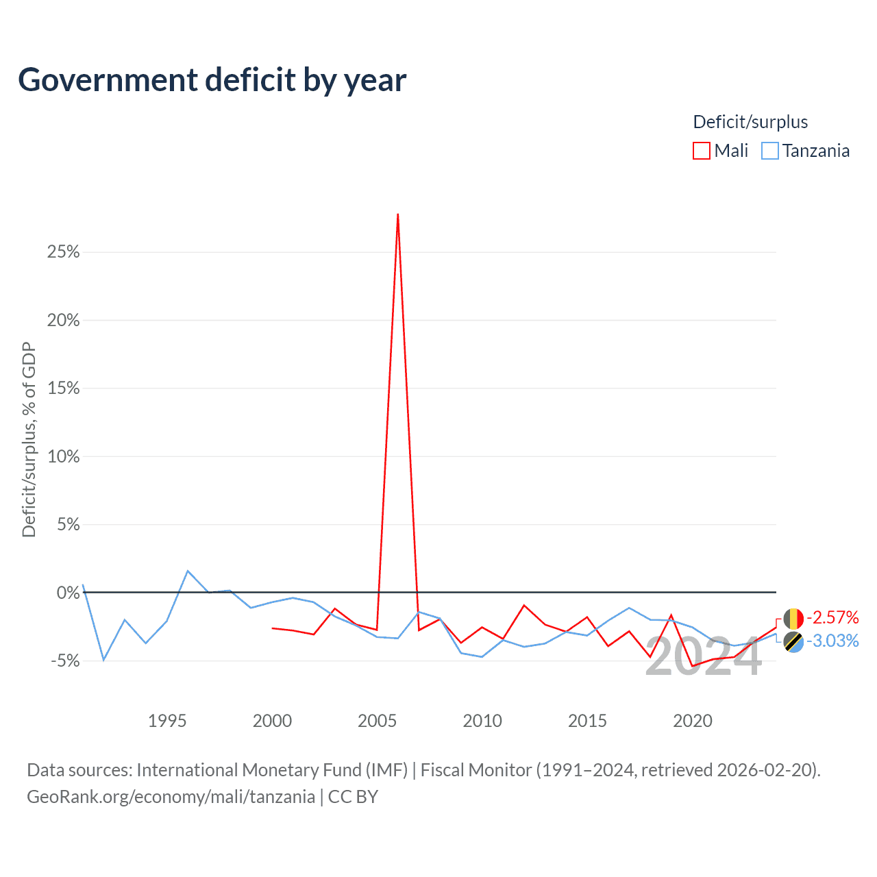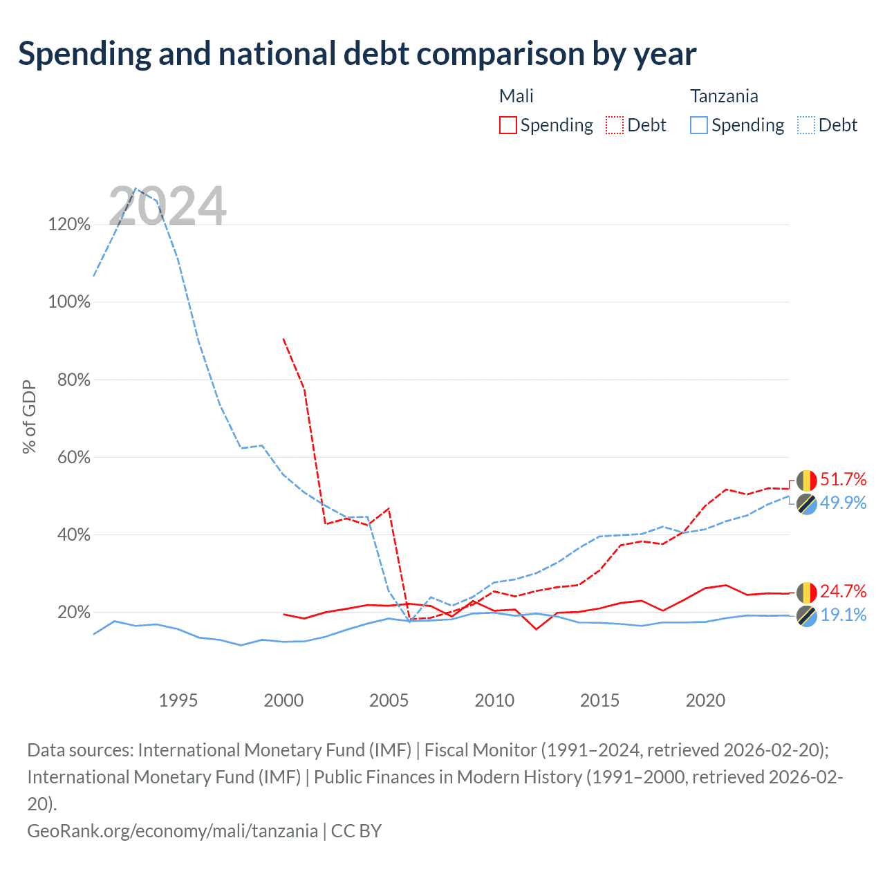 Mali has $13.9B in government debt (51.7% of GDP), compared to $39.3B (49.9% of GDP) in Tanzania.
