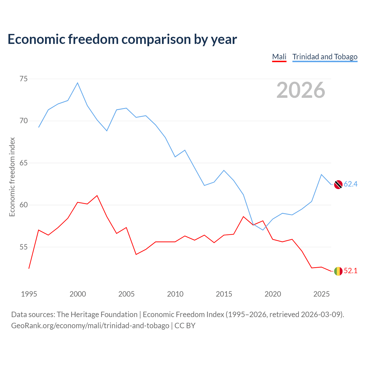 The Economic Freedom Index for Mali is 52.1, ranking 150/197, compared to 62.4 for Trinidad and Tobago, ranking 87/197. The chart above displays a comparison of annual changes in economic freedom indexes.